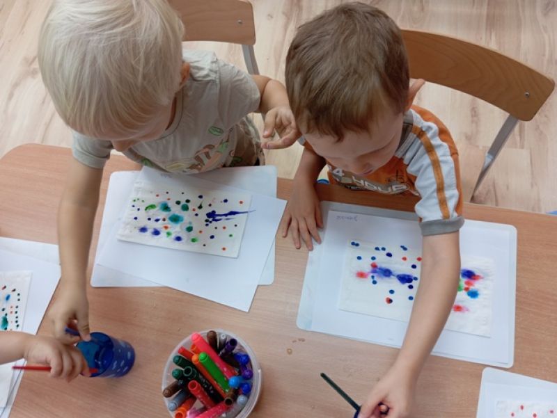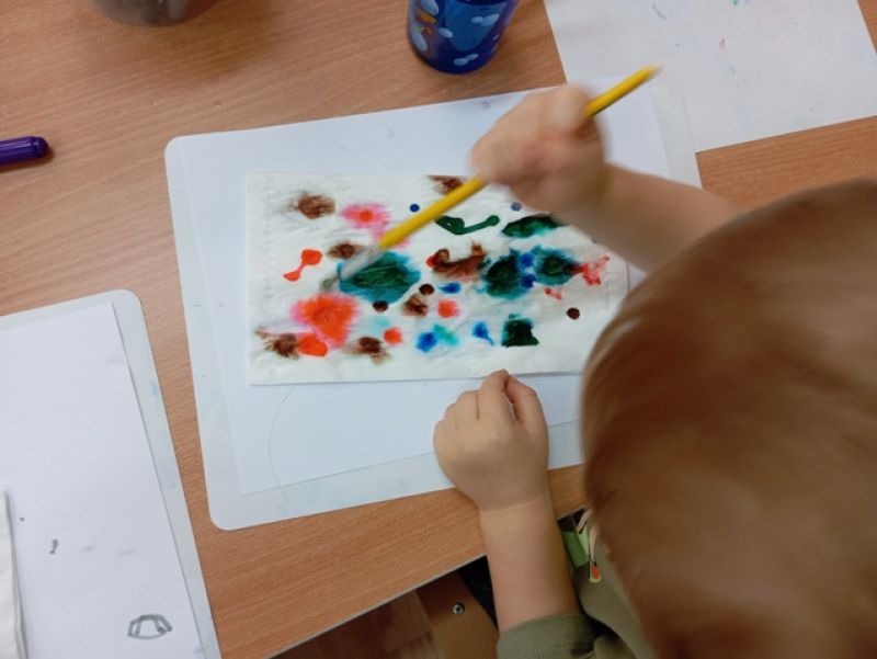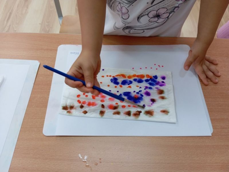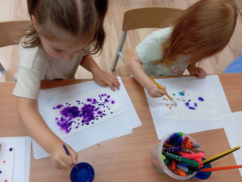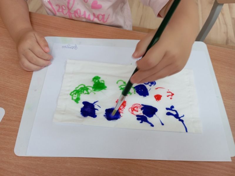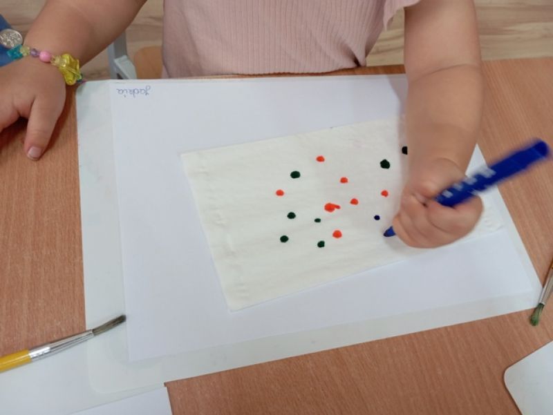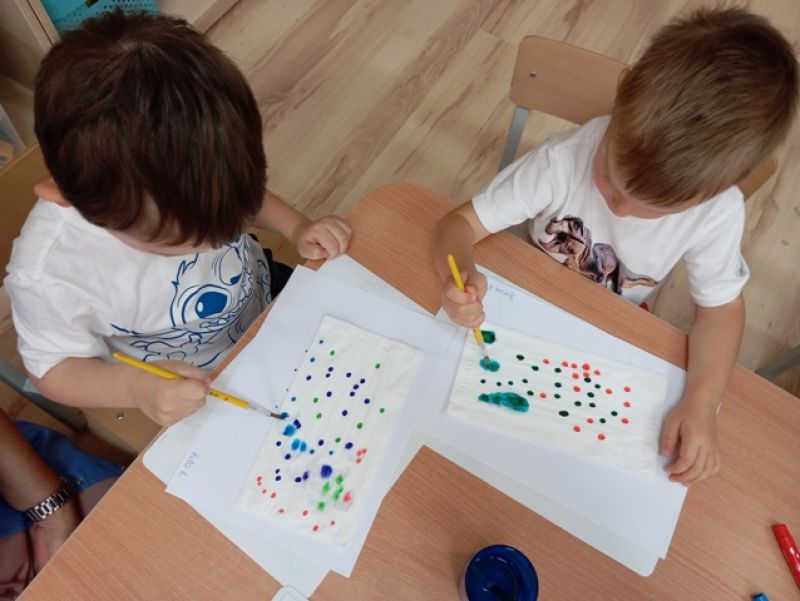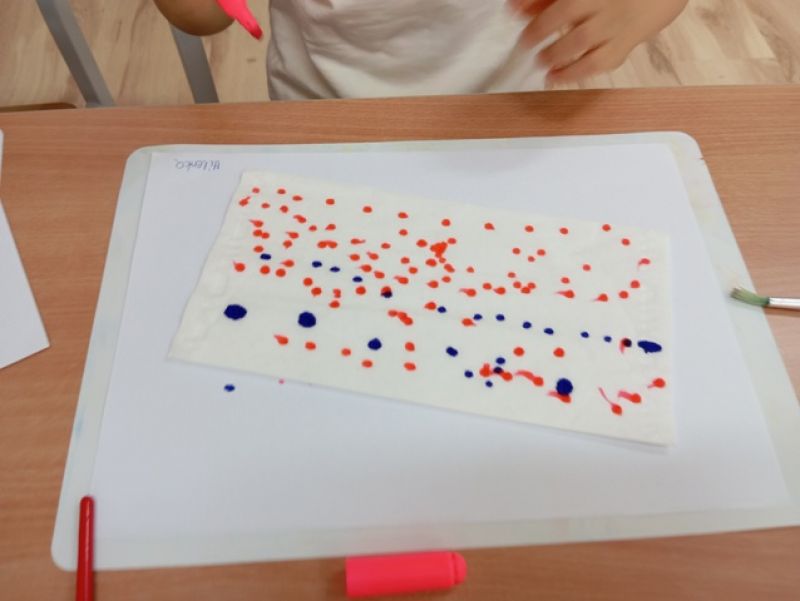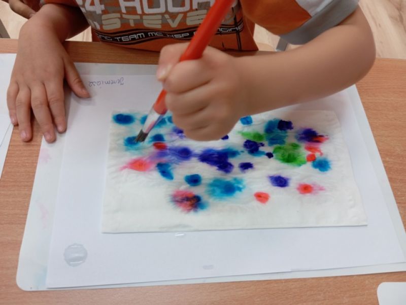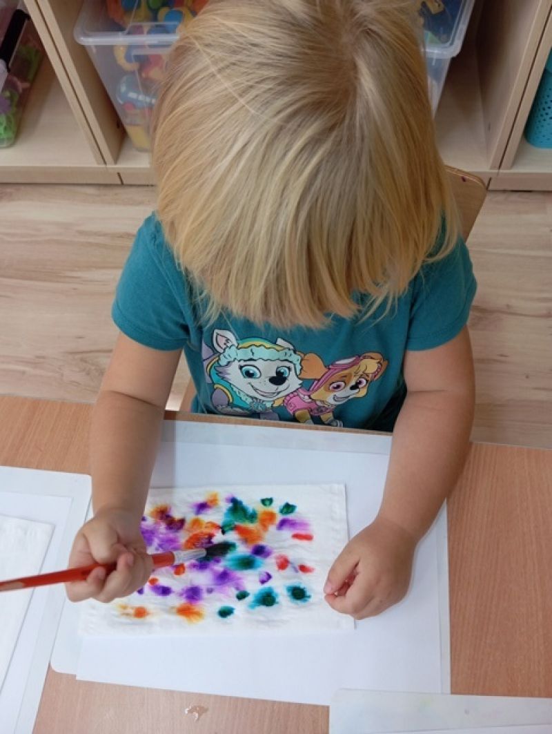 Przedszkolaki opowiadały o swoich umiejętnościach i talentach, a następnie malowały flamastrami kropki na chusteczkach higienicznych i moczyły je delikatnie wodą, podziwiając swoje wielobarwne obrazy.
