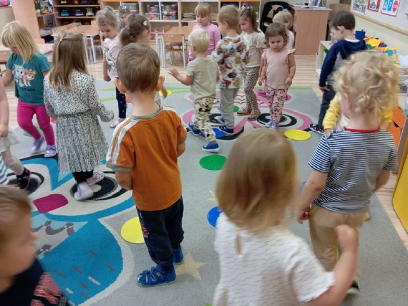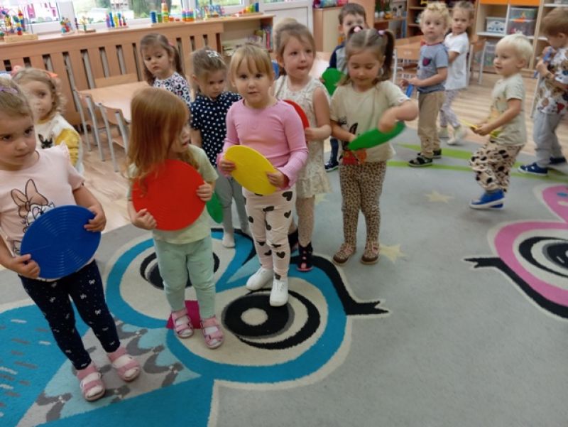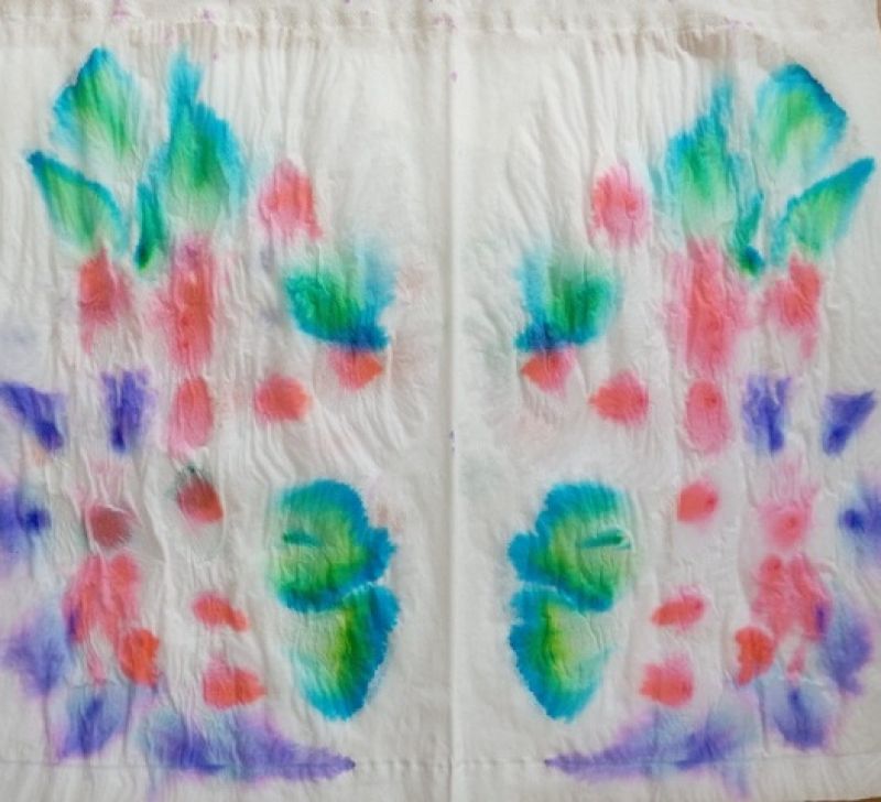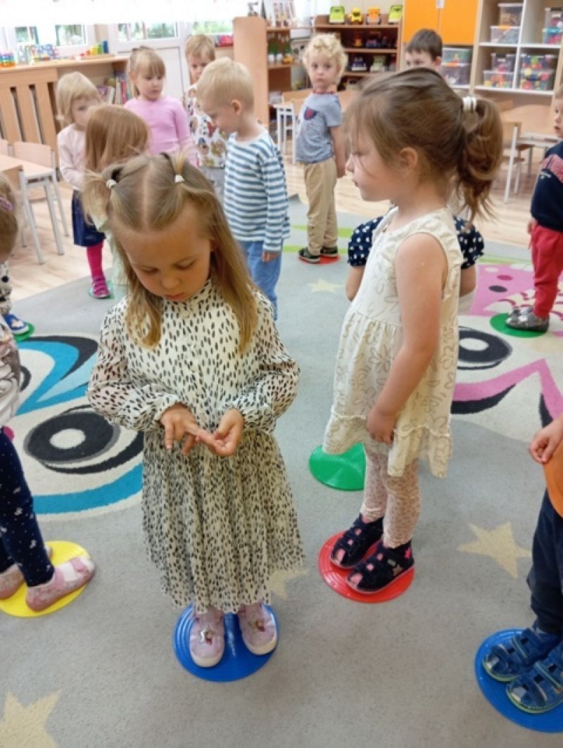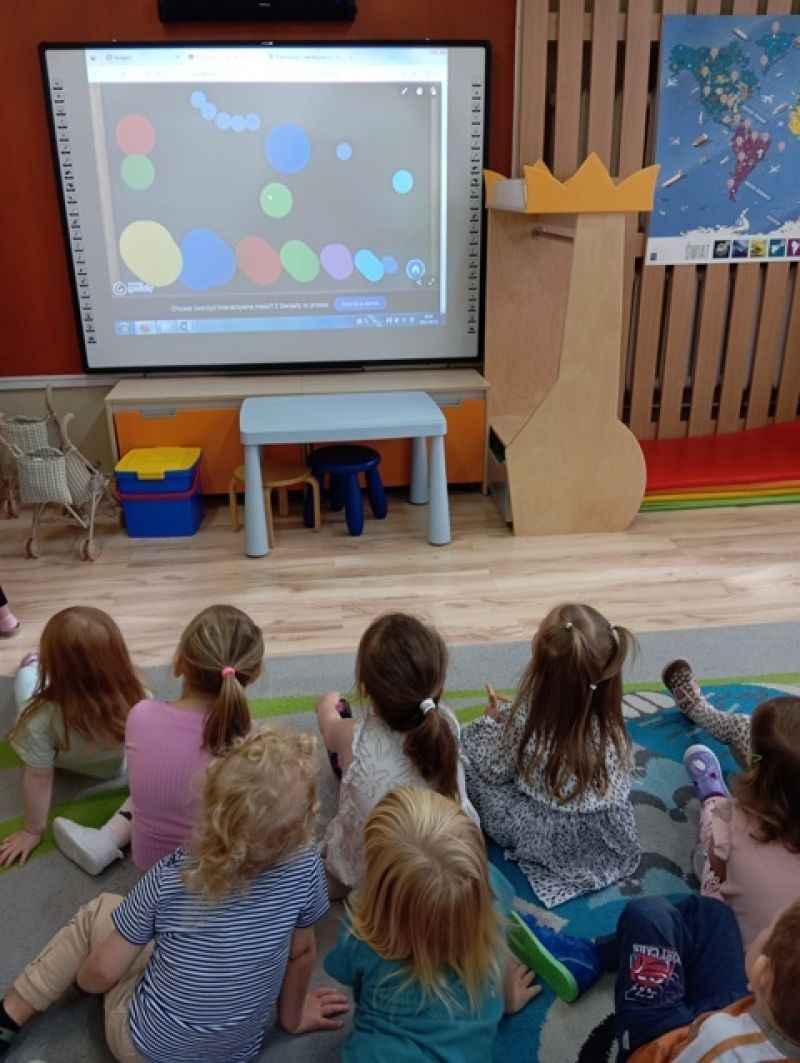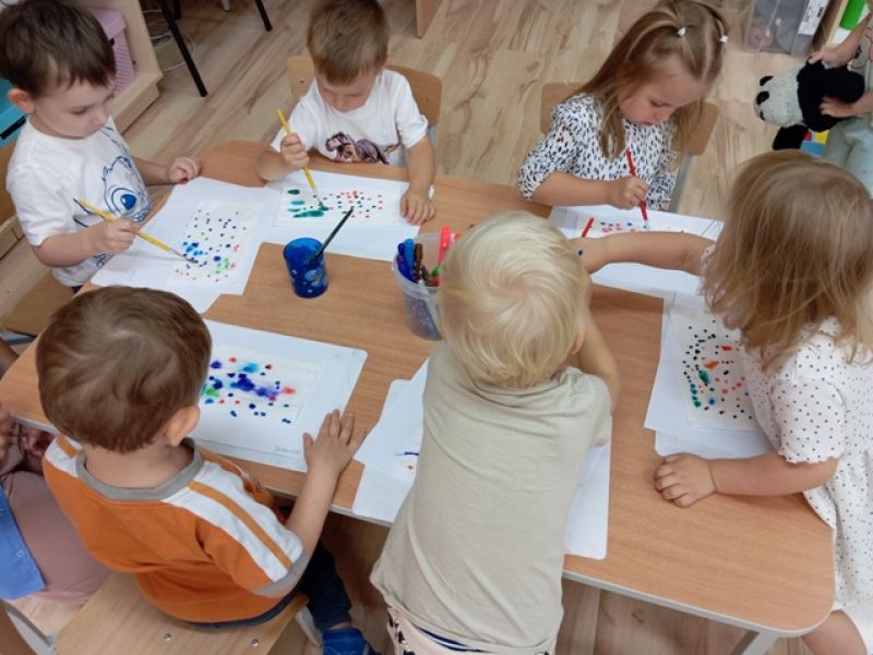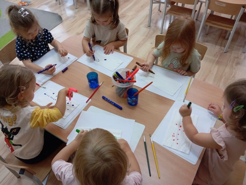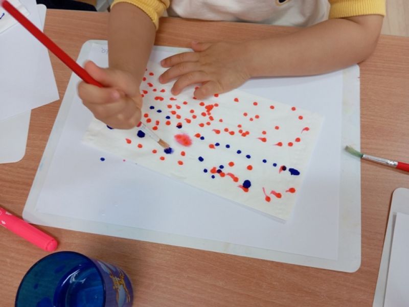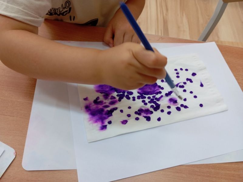 Przedszkolaki opowiadały o swoich umiejętnościach i talentach, a następnie malowały flamastrami kropki na chusteczkach higienicznych i moczyły je delikatnie wodą, podziwiając swoje wielobarwne obrazy.