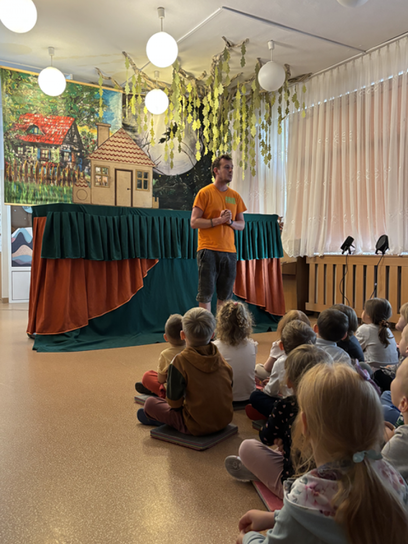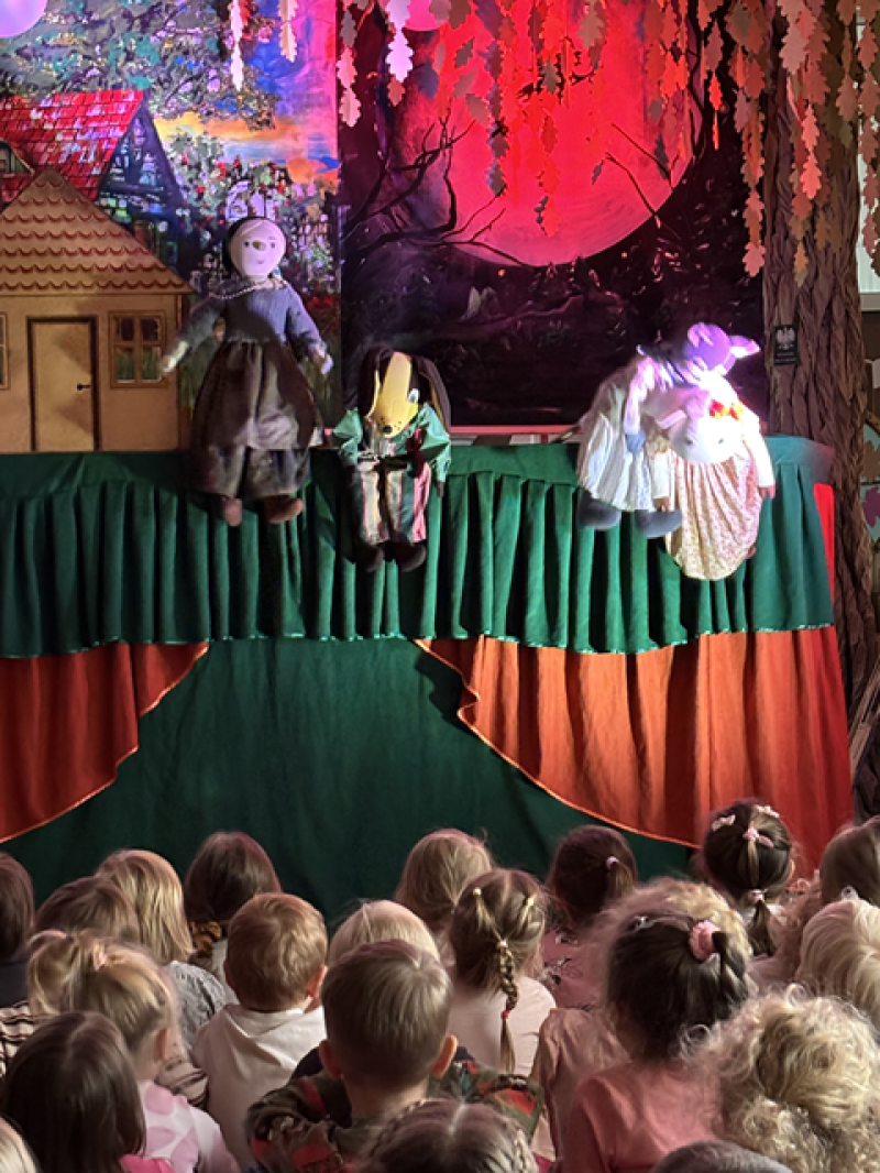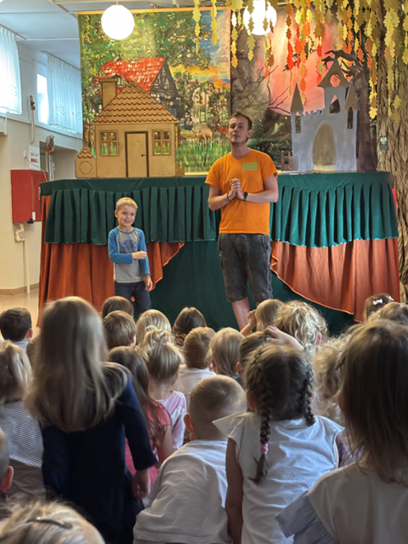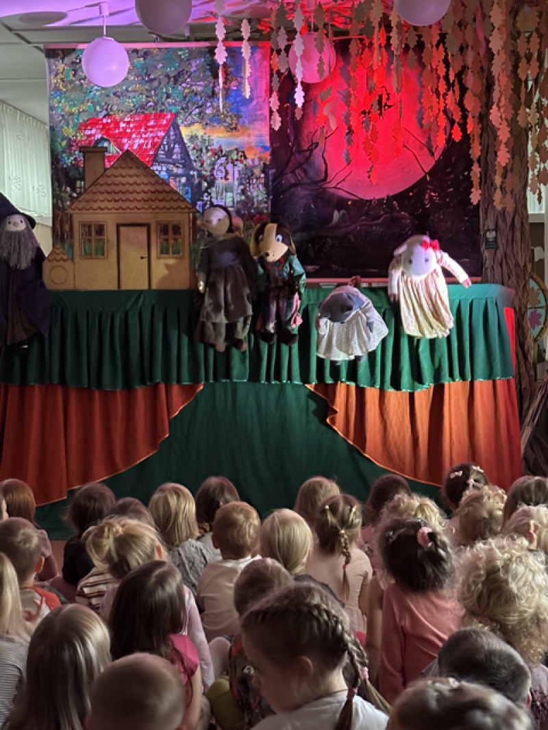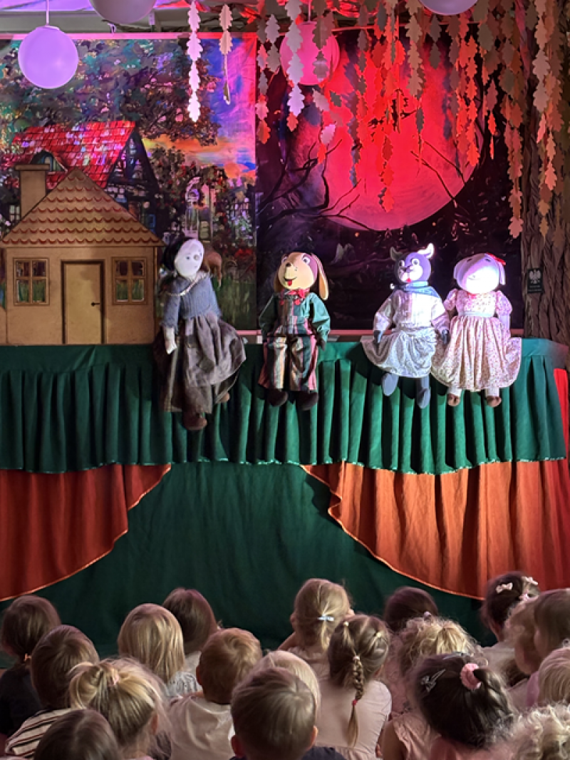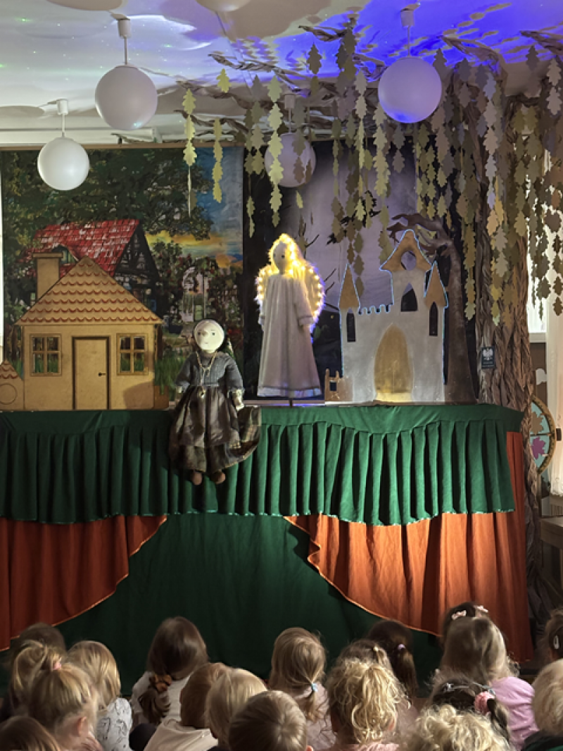 17.10.2025-  wszystkie przedszkolaki obejrzały przedstawienie "Droga do szczęścia" w wykonaniu Teatru Lalek "Kukiełka" z Ptaszkowej opowiadającego o staruszce, która szuka szczęścia wśród swoich przyjaciół (psa, kotki i owieczki). Przedstawienie uczy, że prawdziwe szczęście tkwi w przyjaźni i relacjach z innymi ludźmi, a nie w rzeczach materialnych.