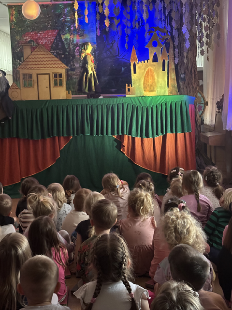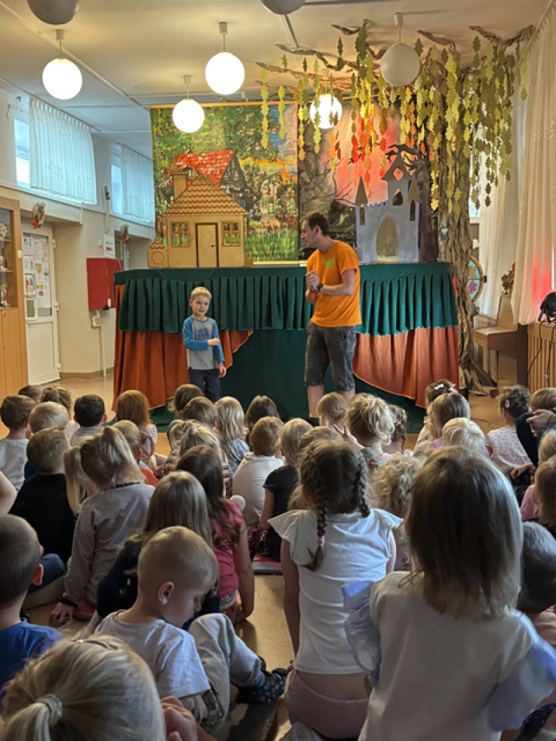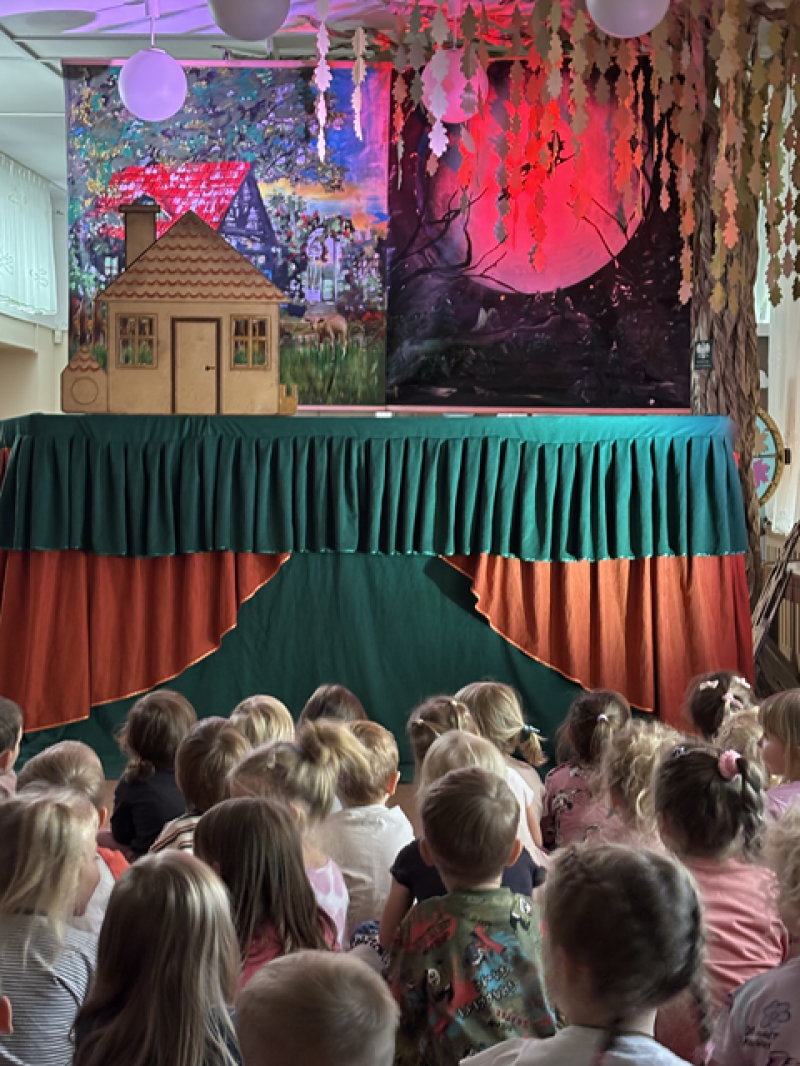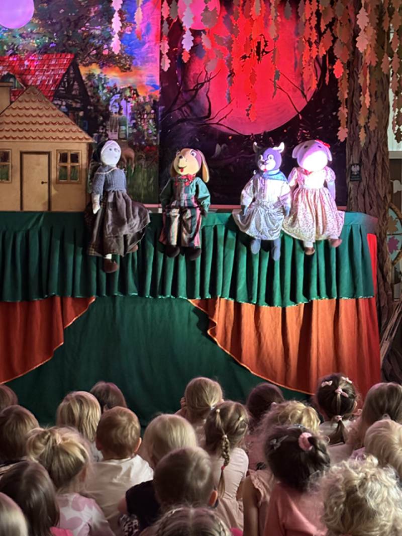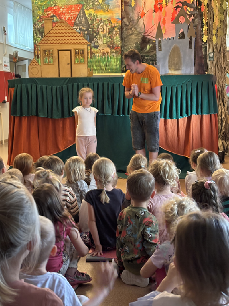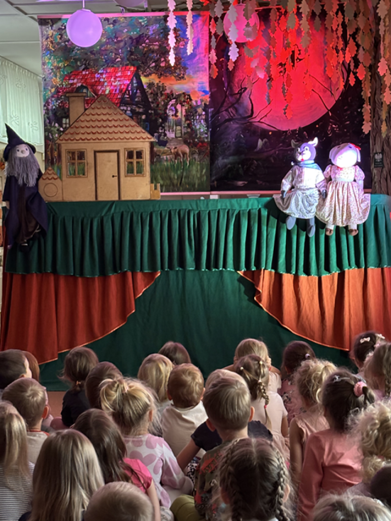 17.10.2025-  wszystkie przedszkolaki obejrzały przedstawienie "Droga do szczęścia" w wykonaniu Teatru Lalek "Kukiełka" z Ptaszkowej opowiadającego o staruszce, która szuka szczęścia wśród swoich przyjaciół (psa, kotki i owieczki). Przedstawienie uczy, że prawdziwe szczęście tkwi w przyjaźni i relacjach z innymi ludźmi, a nie w rzeczach materialnych.