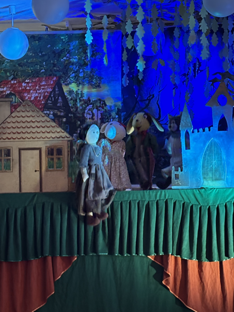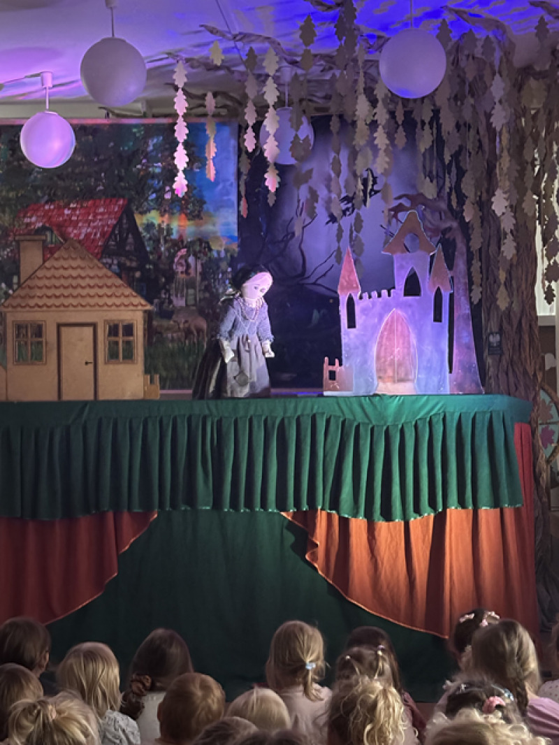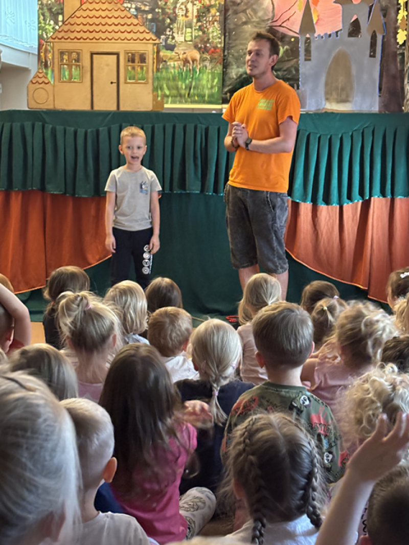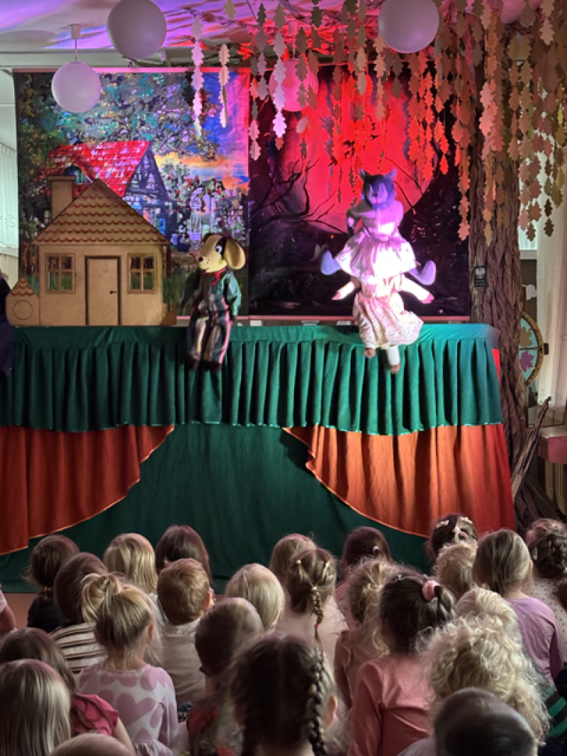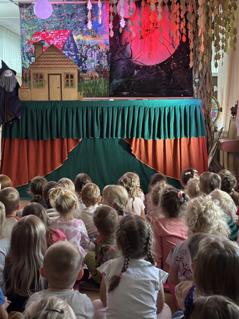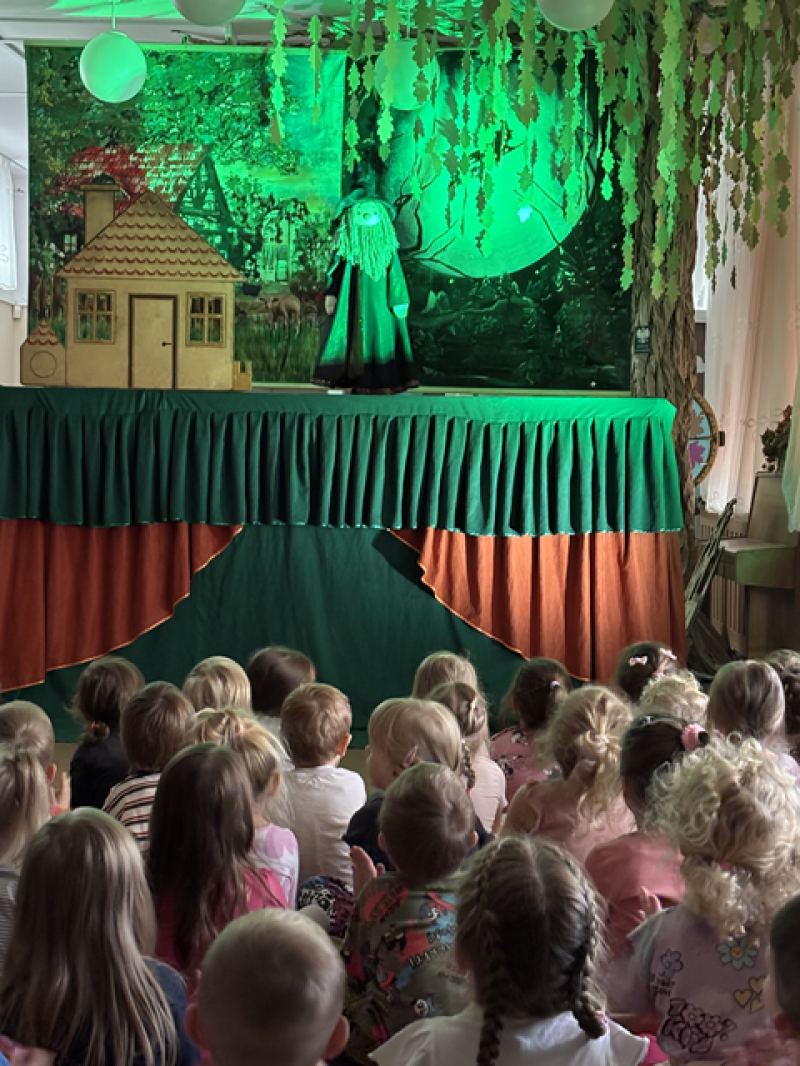 17.10.2025-  wszystkie przedszkolaki obejrzały przedstawienie "Droga do szczęścia" w wykonaniu Teatru Lalek "Kukiełka" z Ptaszkowej opowiadającego o staruszce, która szuka szczęścia wśród swoich przyjaciół (psa, kotki i owieczki). Przedstawienie uczy, że prawdziwe szczęście tkwi w przyjaźni i relacjach z innymi ludźmi, a nie w rzeczach materialnych.