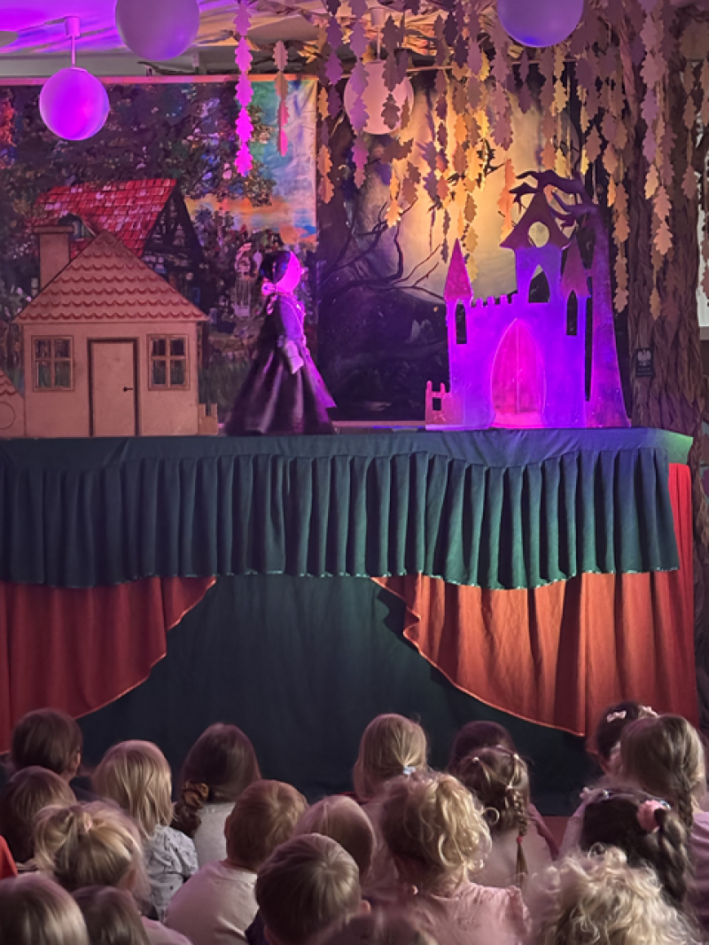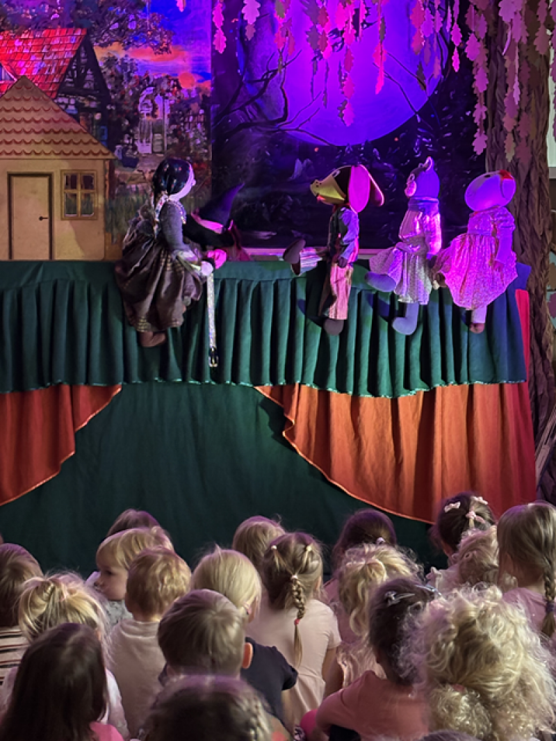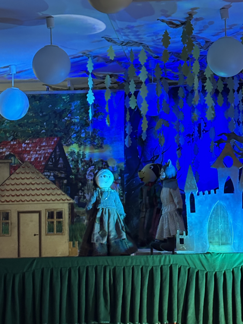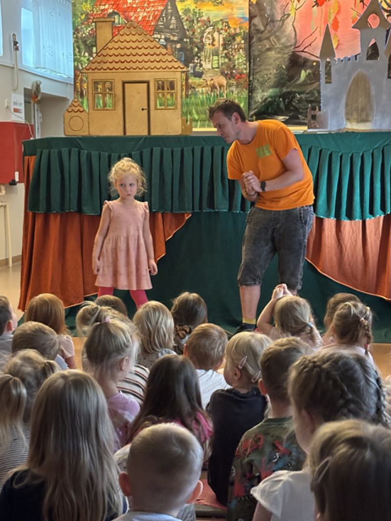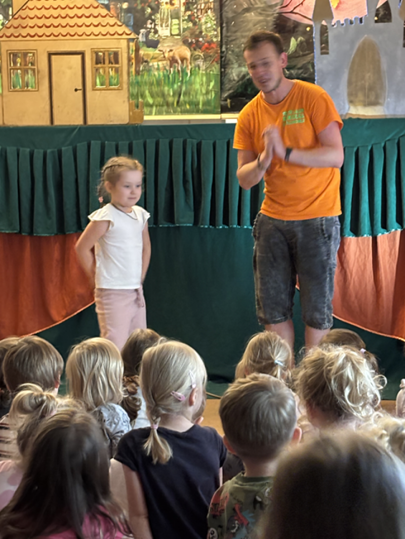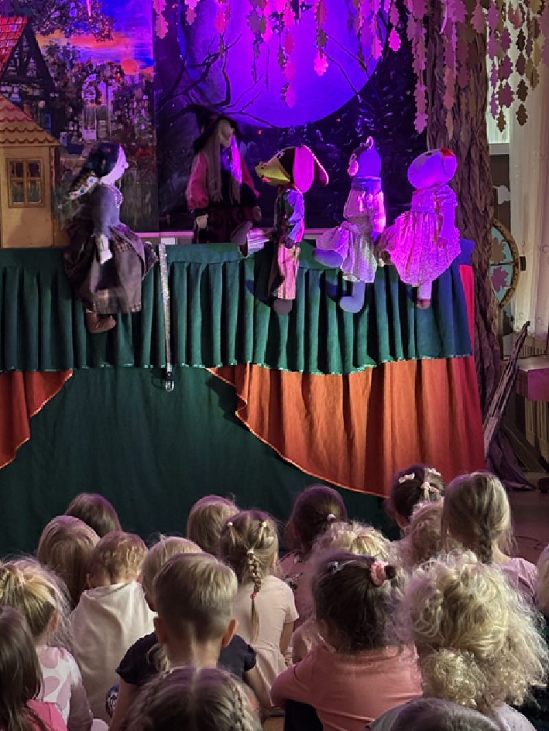 17.10.2025-  wszystkie przedszkolaki obejrzały przedstawienie "Droga do szczęścia" w wykonaniu Teatru Lalek "Kukiełka" z Ptaszkowej opowiadającego o staruszce, która szuka szczęścia wśród swoich przyjaciół (psa, kotki i owieczki). Przedstawienie uczy, że prawdziwe szczęście tkwi w przyjaźni i relacjach z innymi ludźmi, a nie w rzeczach materialnych.