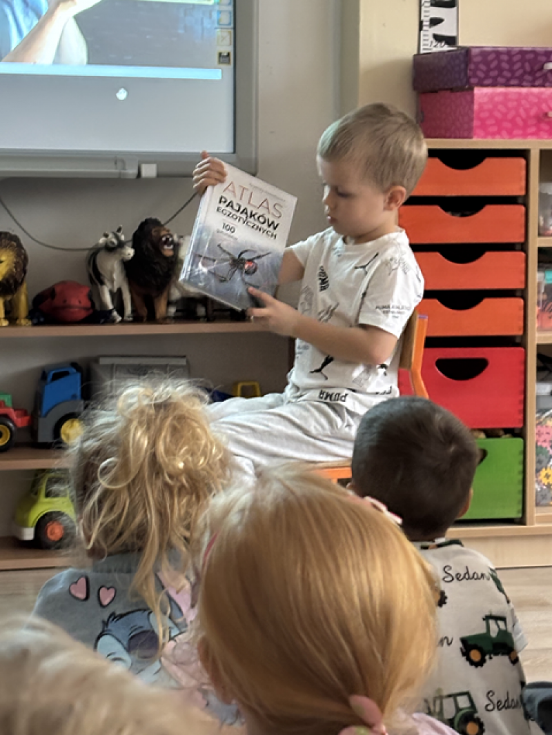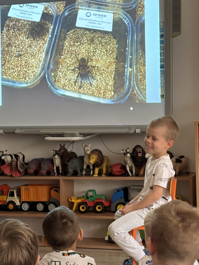 Opowiedział dzieciom m.in. jak zbudowany jest pająk, czym się odżywia, w jaki sposób i w jakim celu pająki tworzą pajęczyny, jak wygląda i jak się nazywa największy pająk w Polsce i na świecie oraz najbardziej jadowity pająk na świecie. Wymienił różne nazwy pająków.