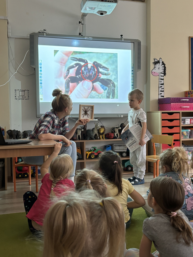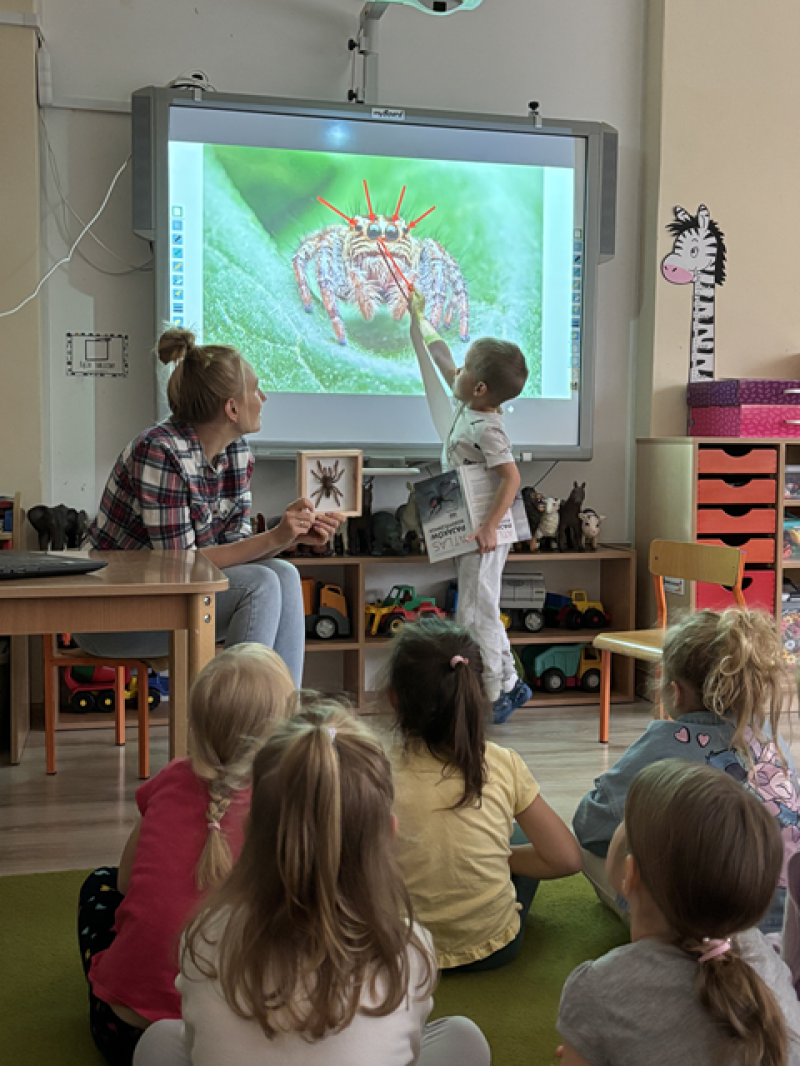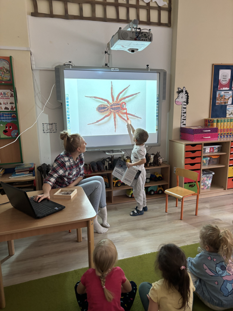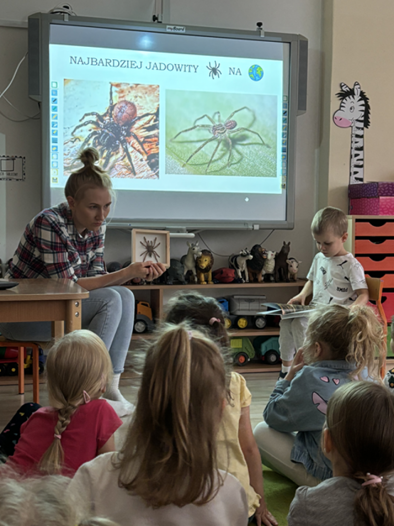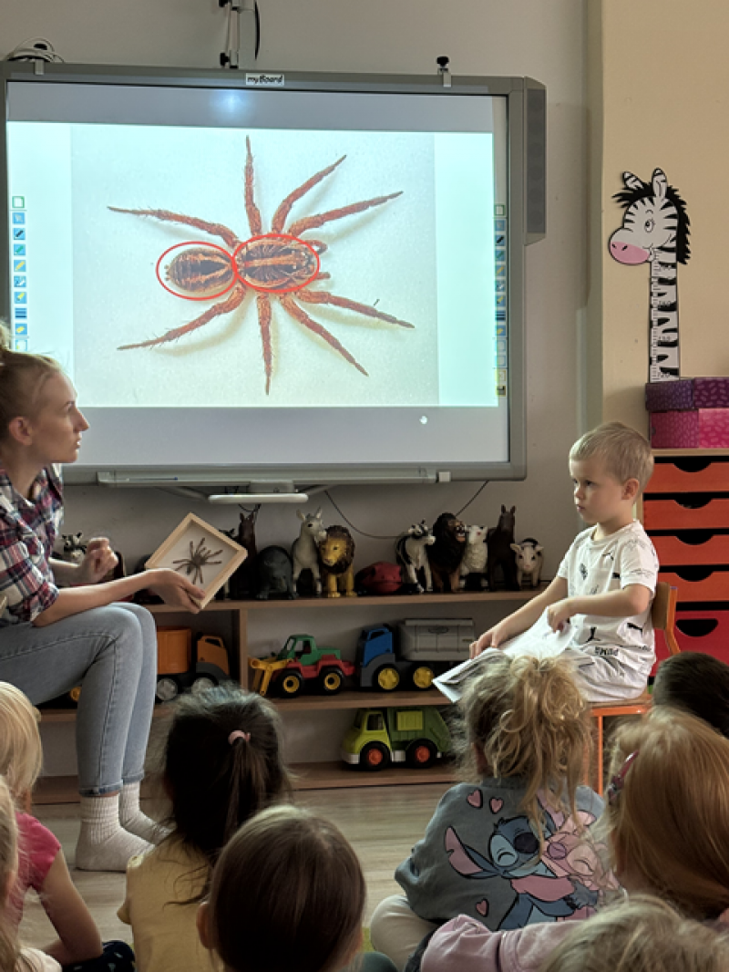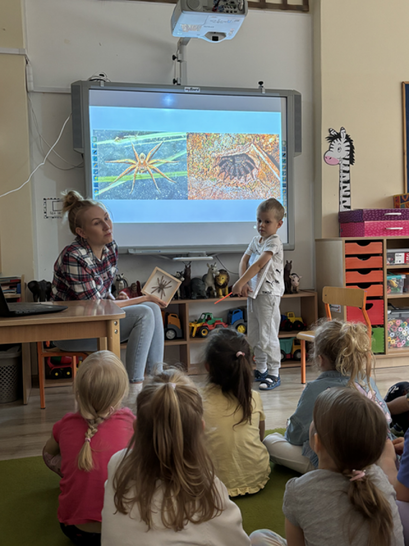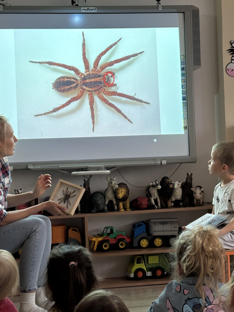 Zajęcia miały na celu oswojenie dzieci z pająkami i ukazanie niezwykle pożytecznej funkcji spełnianej przez te zwierzęta w przyrodzie.
