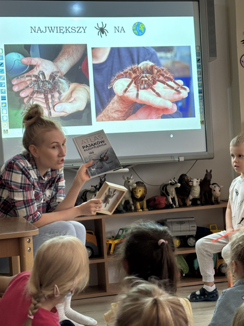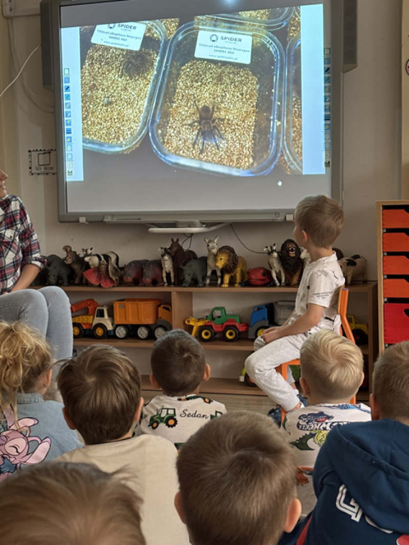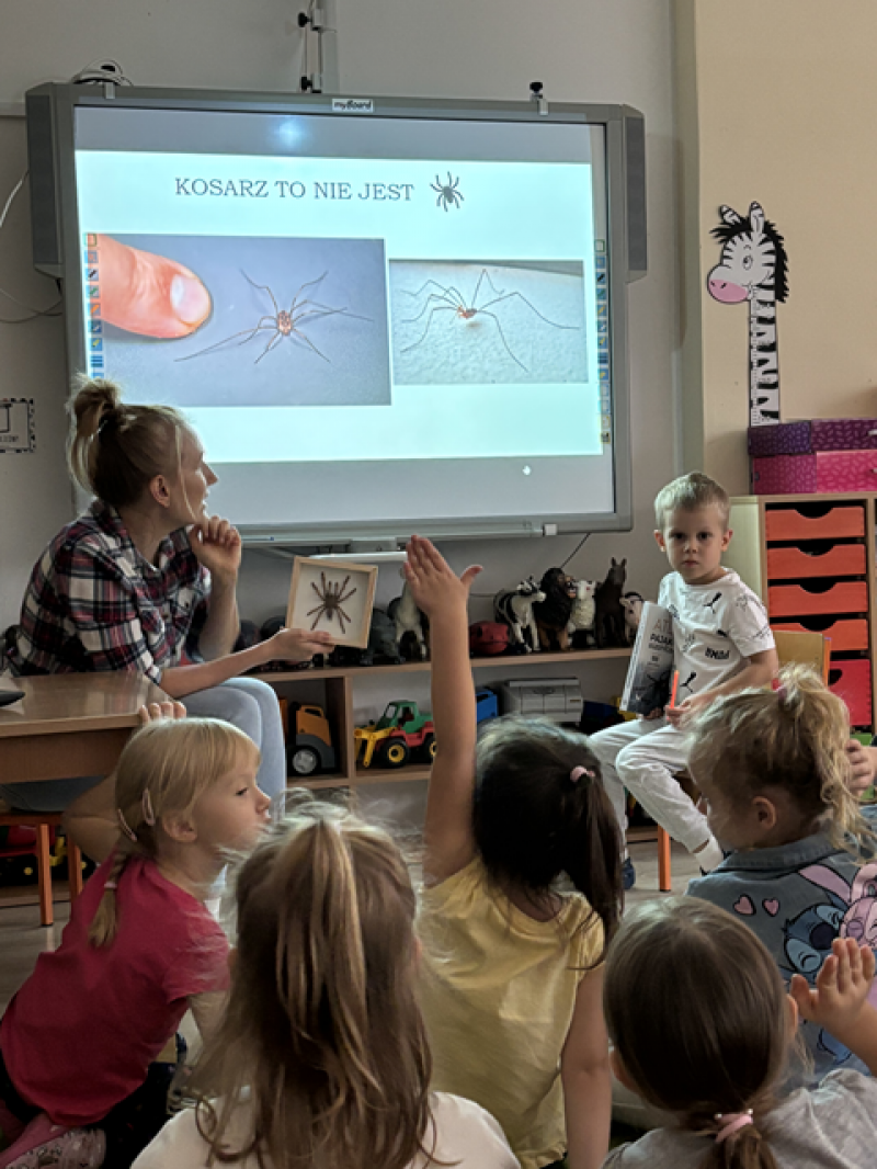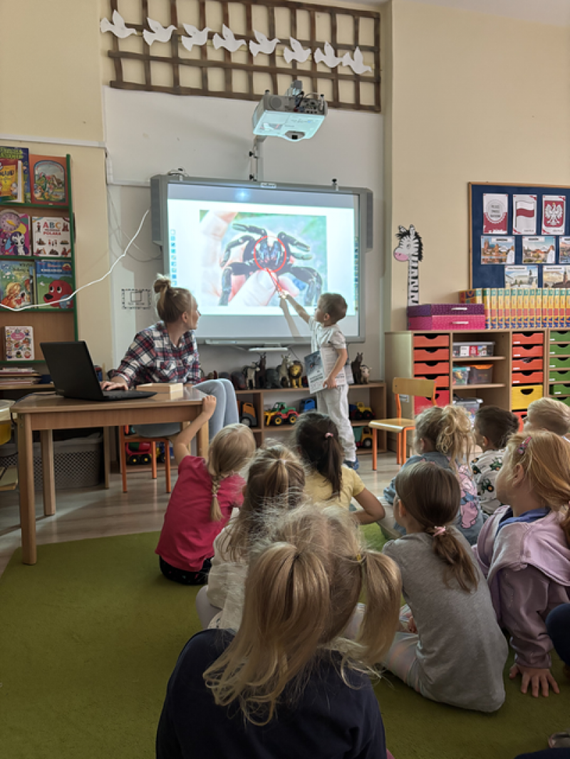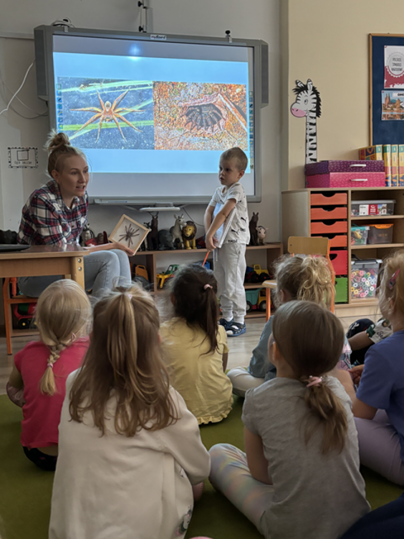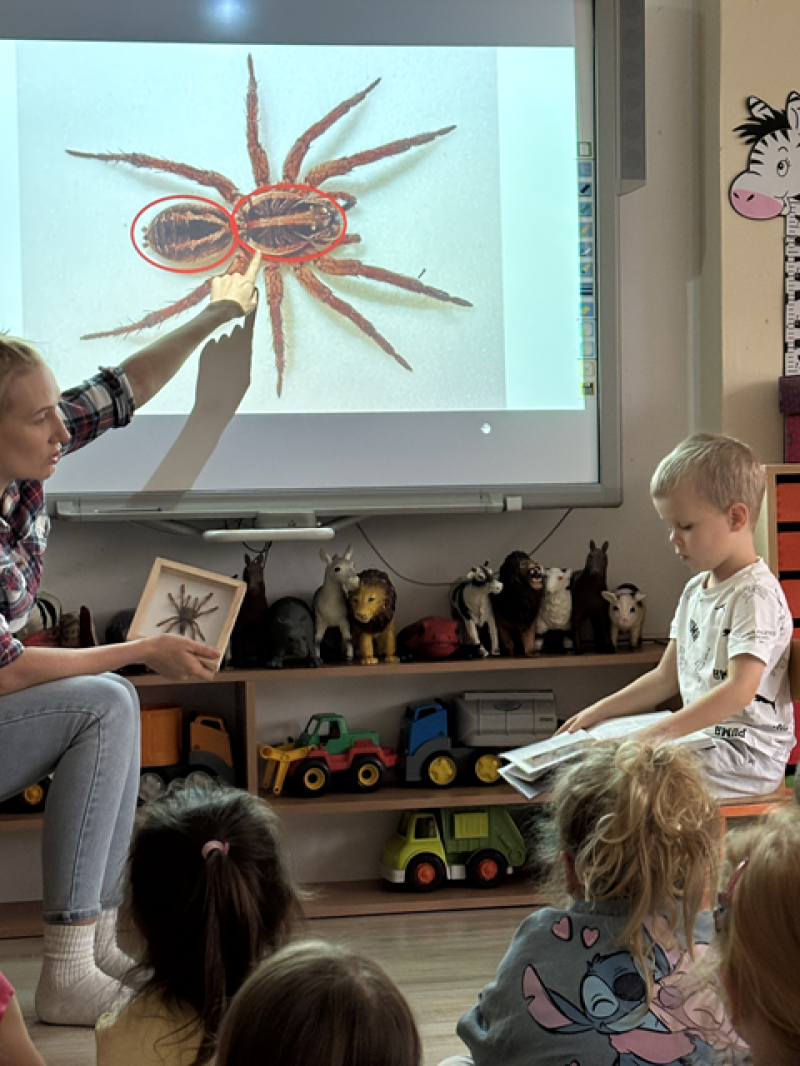 Zajęcia miały na celu oswojenie dzieci z pająkami i ukazanie niezwykle pożytecznej funkcji spełnianej przez te zwierzęta w przyrodzie.