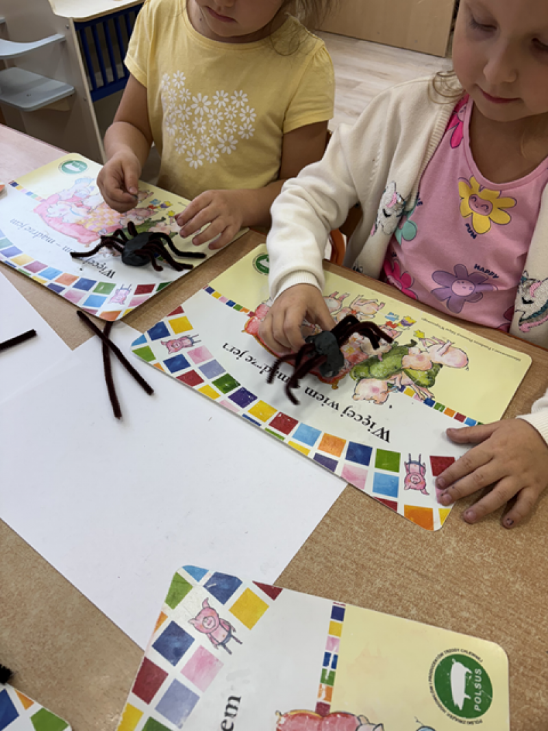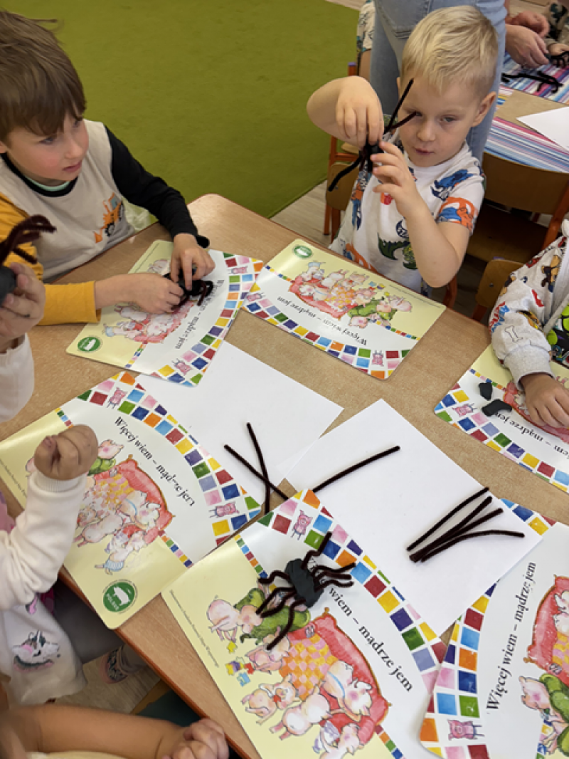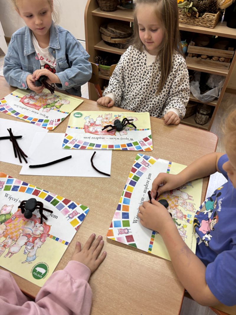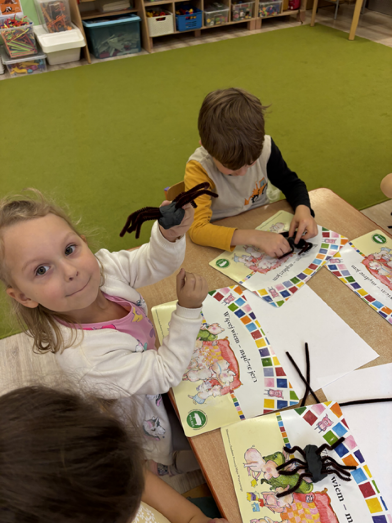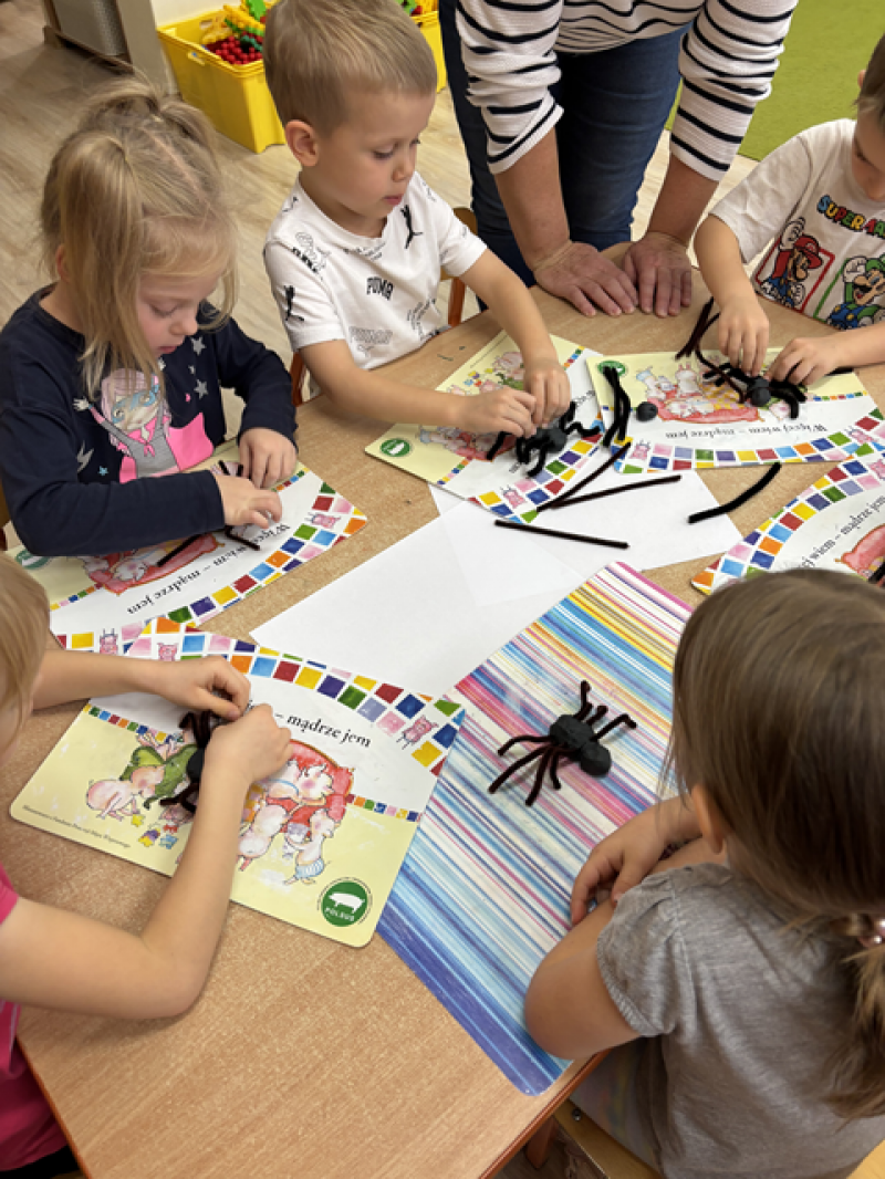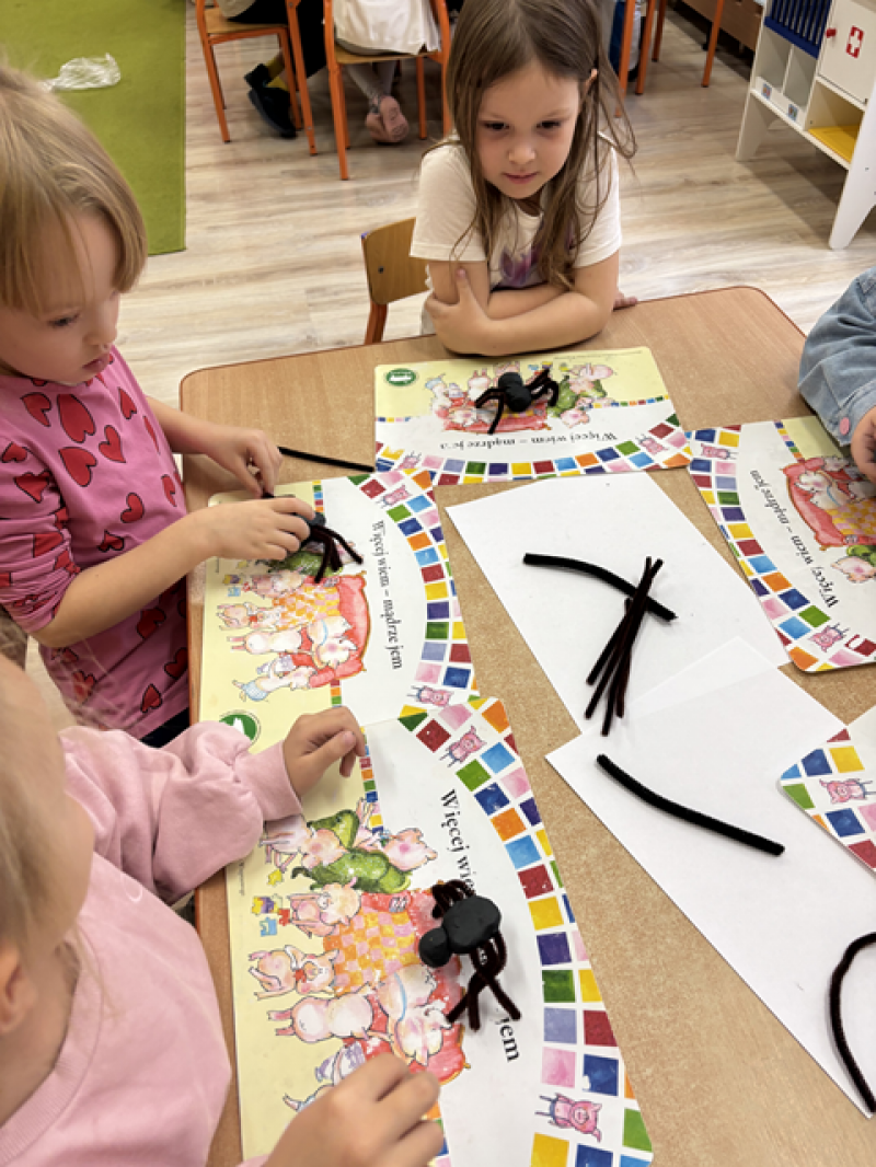 Dzieci rozwiązywały karty pracy, tworzyły pajęczą sieć z talerzyka papierowego i sznurka, a także wykonały własnego pająka z plasteliny i drucików kreatywnych.