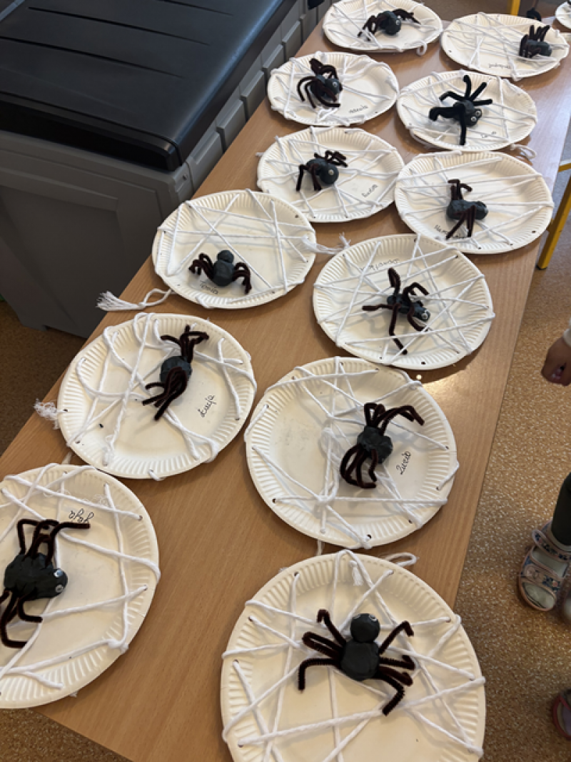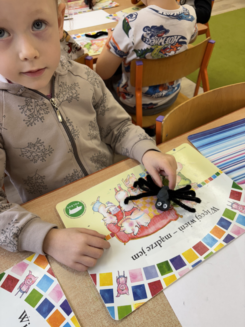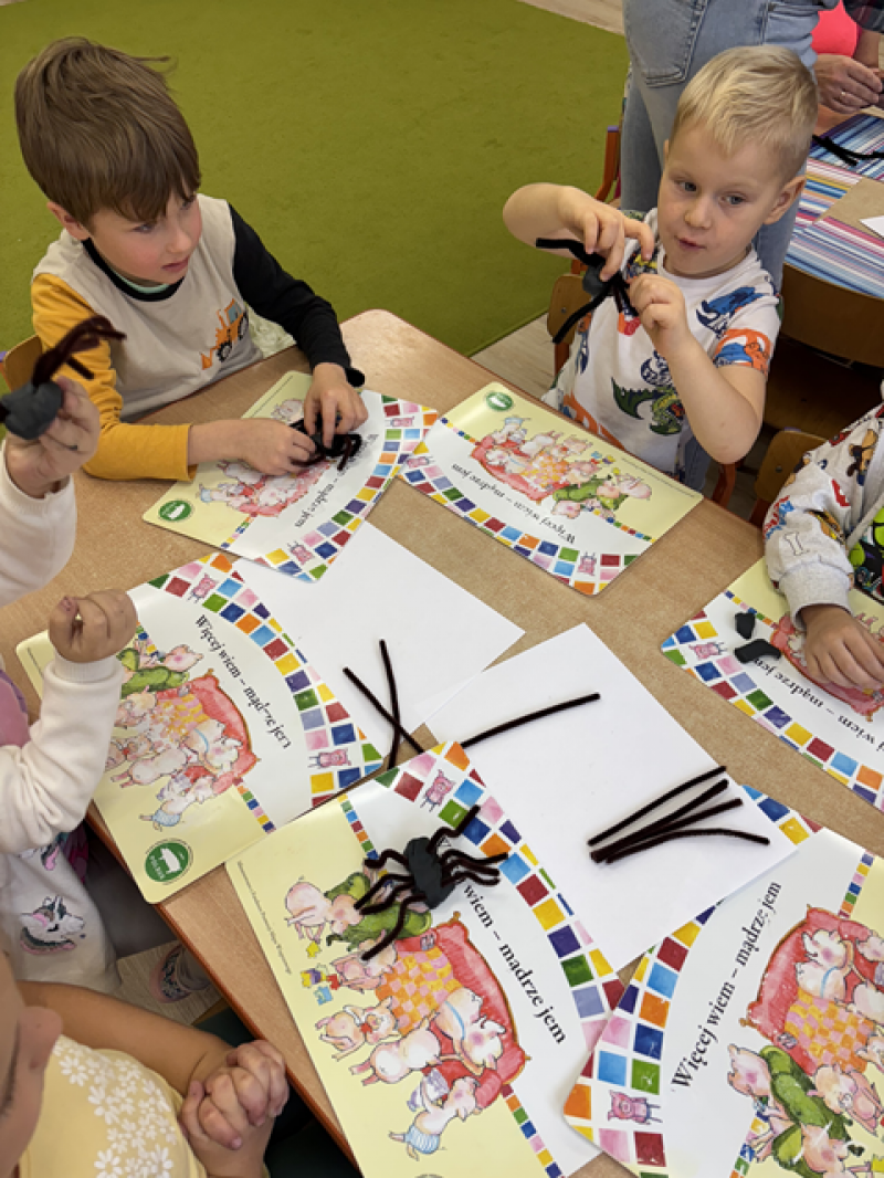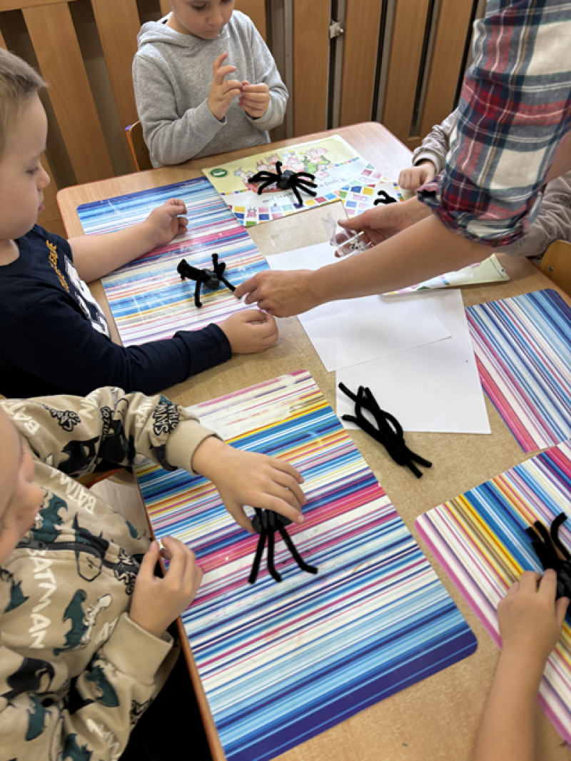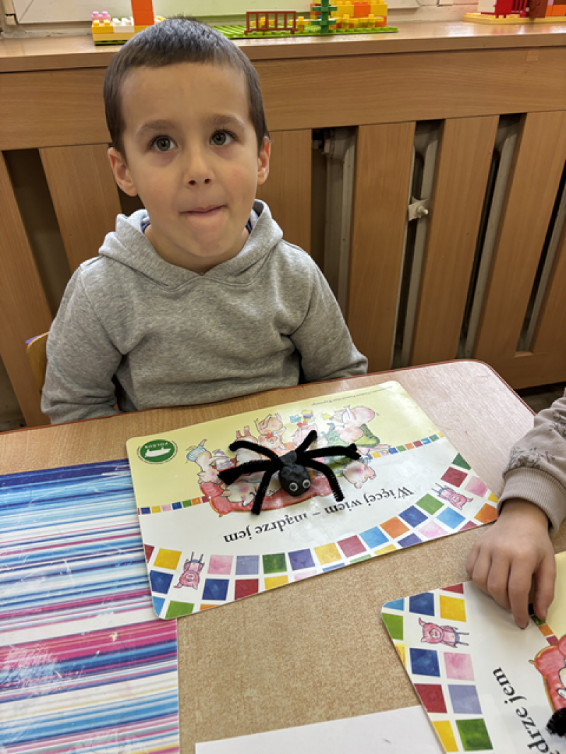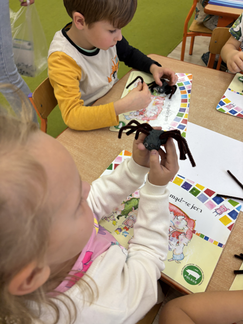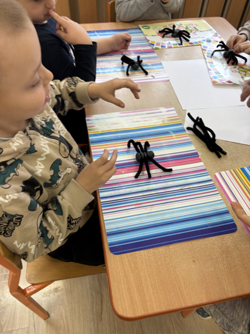 Dzieci rozwiązywały karty pracy, tworzyły pajęczą sieć z talerzyka papierowego i sznurka, a także wykonały własnego pająka z plasteliny i drucików kreatywnych.