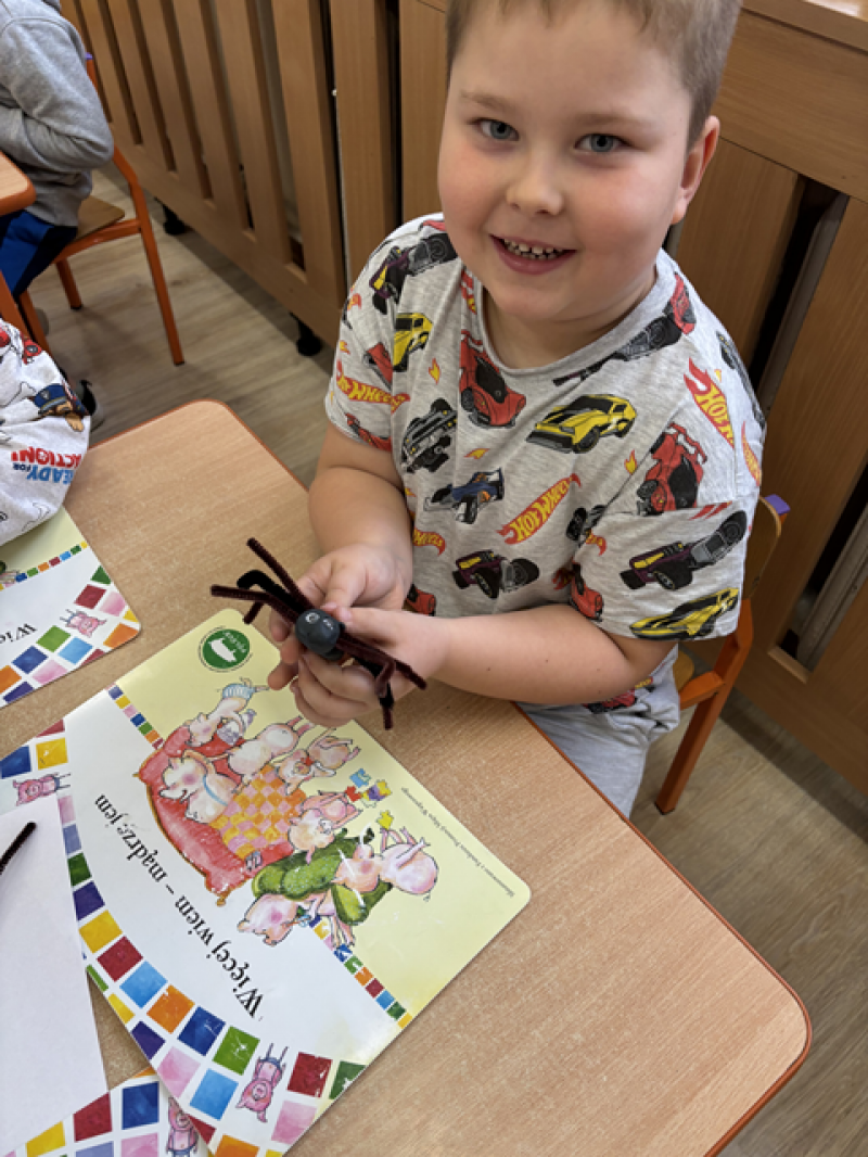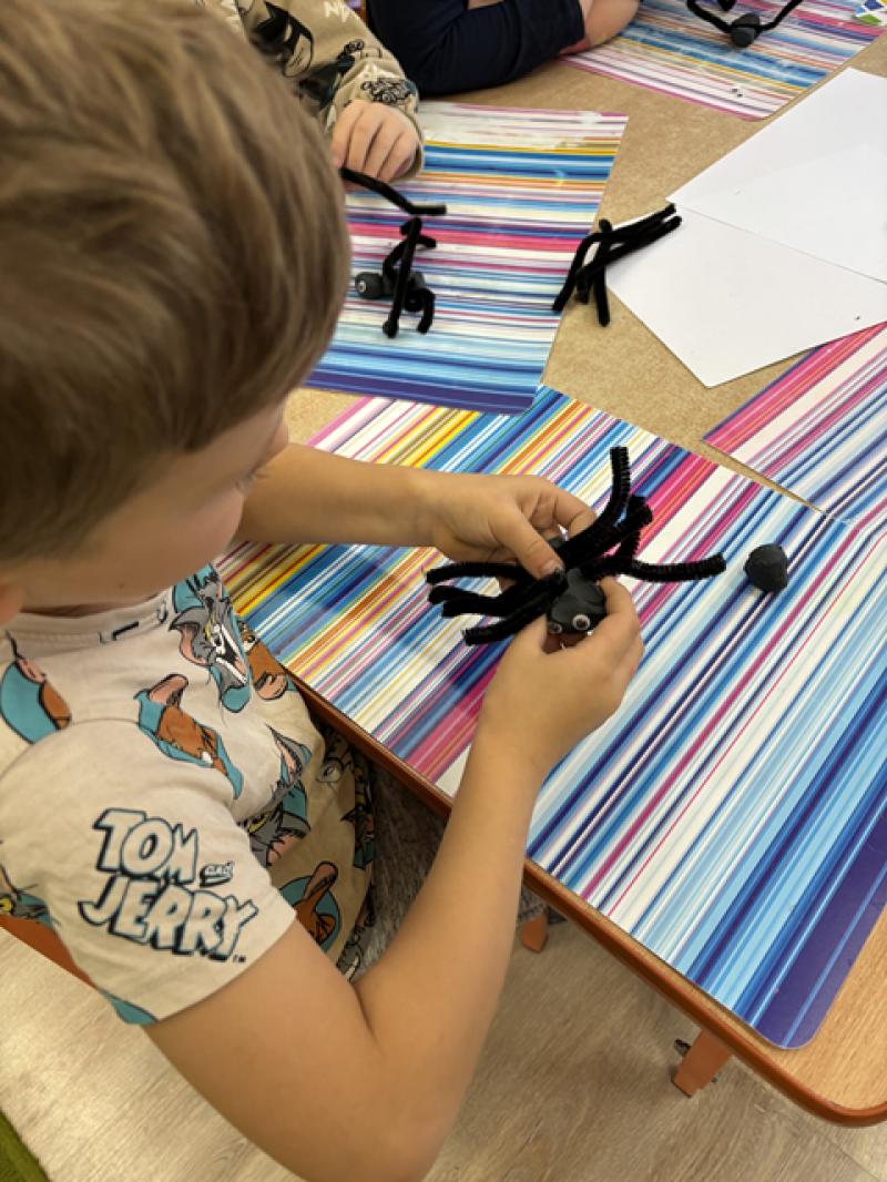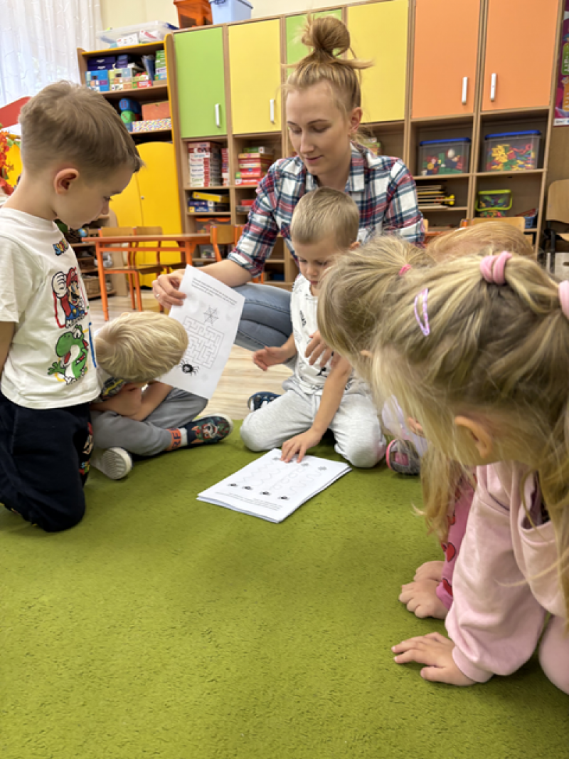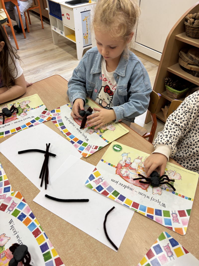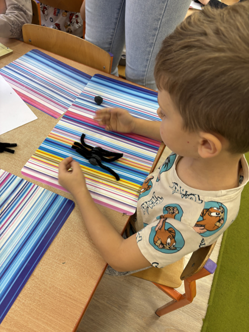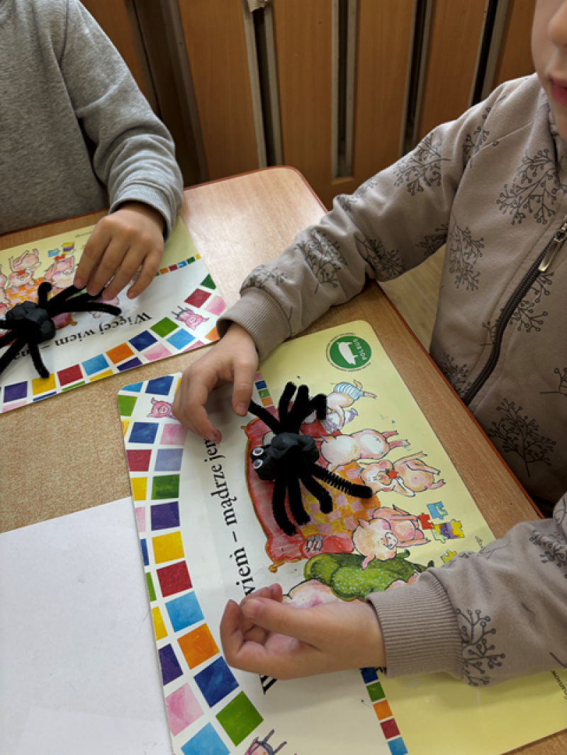 Dzieci rozwiązywały karty pracy, tworzyły pajęczą sieć z talerzyka papierowego i sznurka, a także wykonały własnego pająka z plasteliny i drucików kreatywnych.