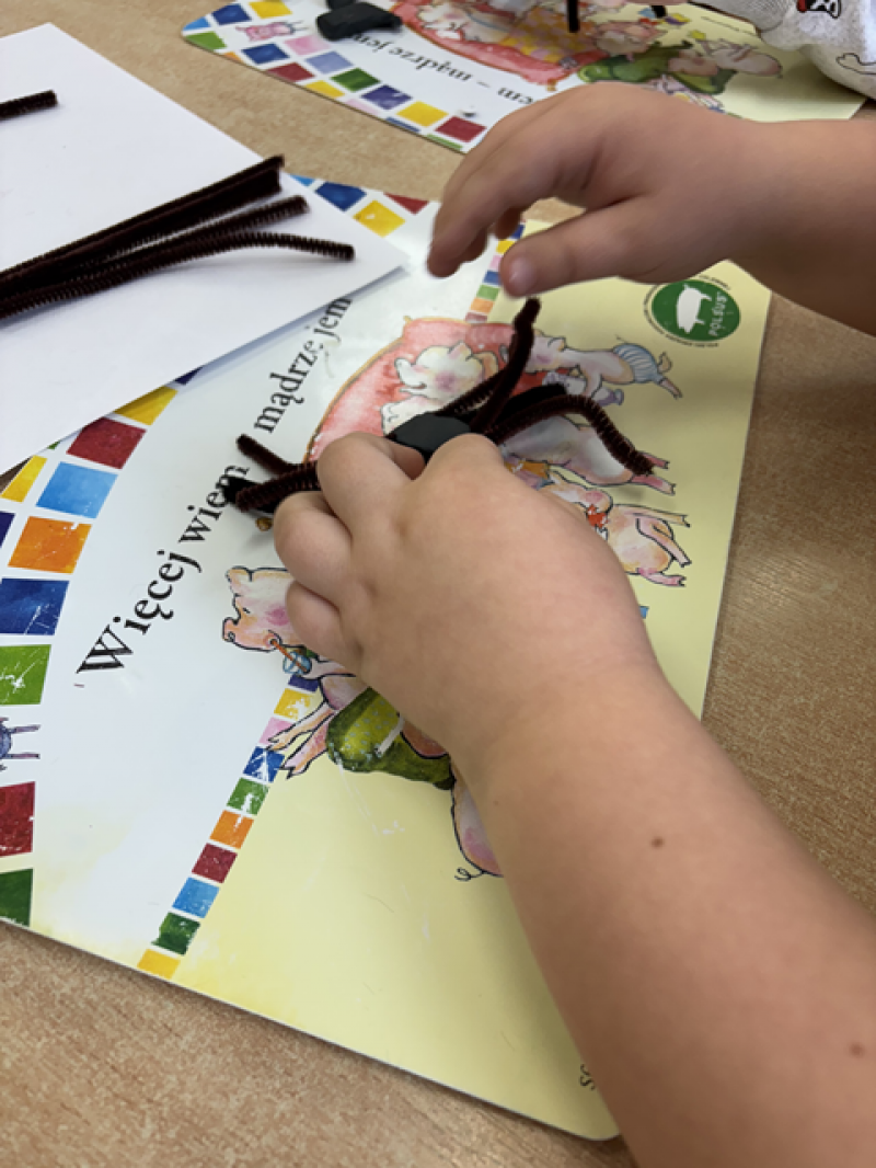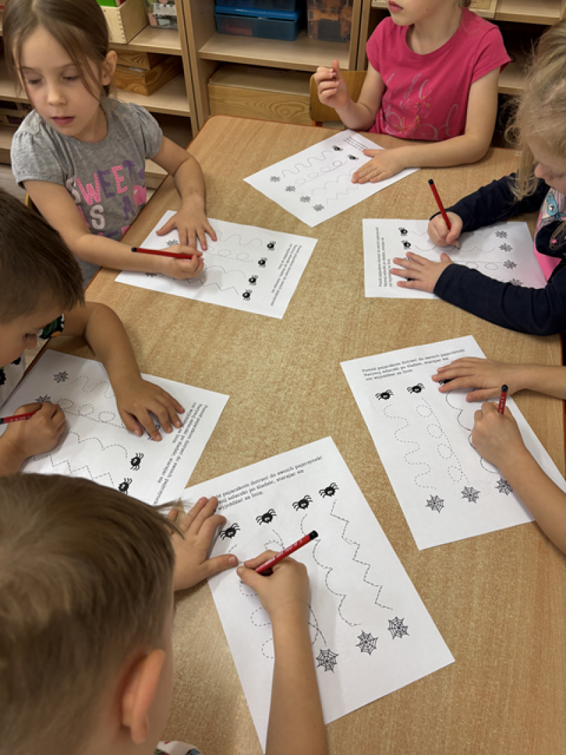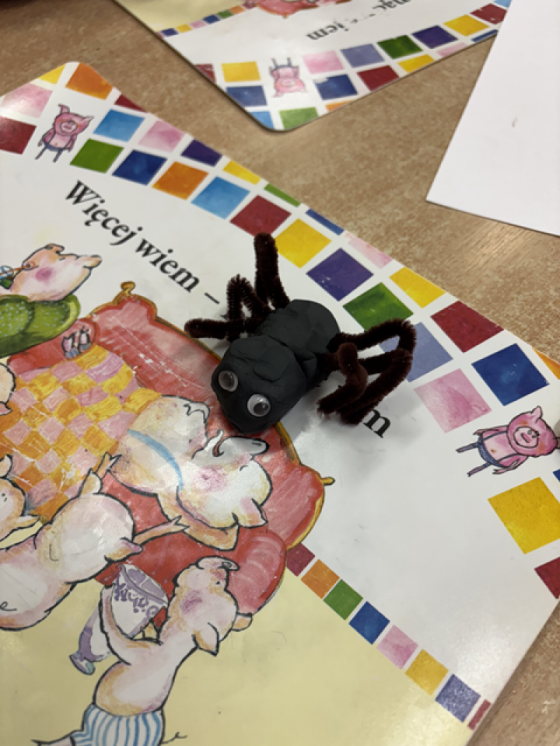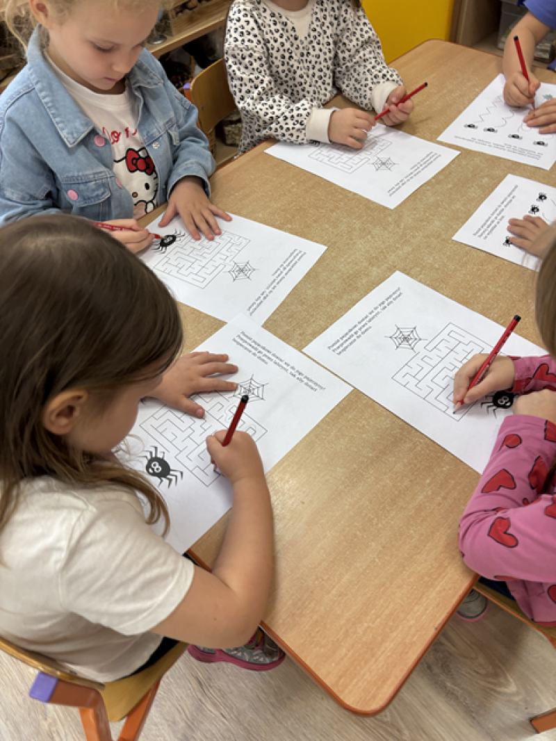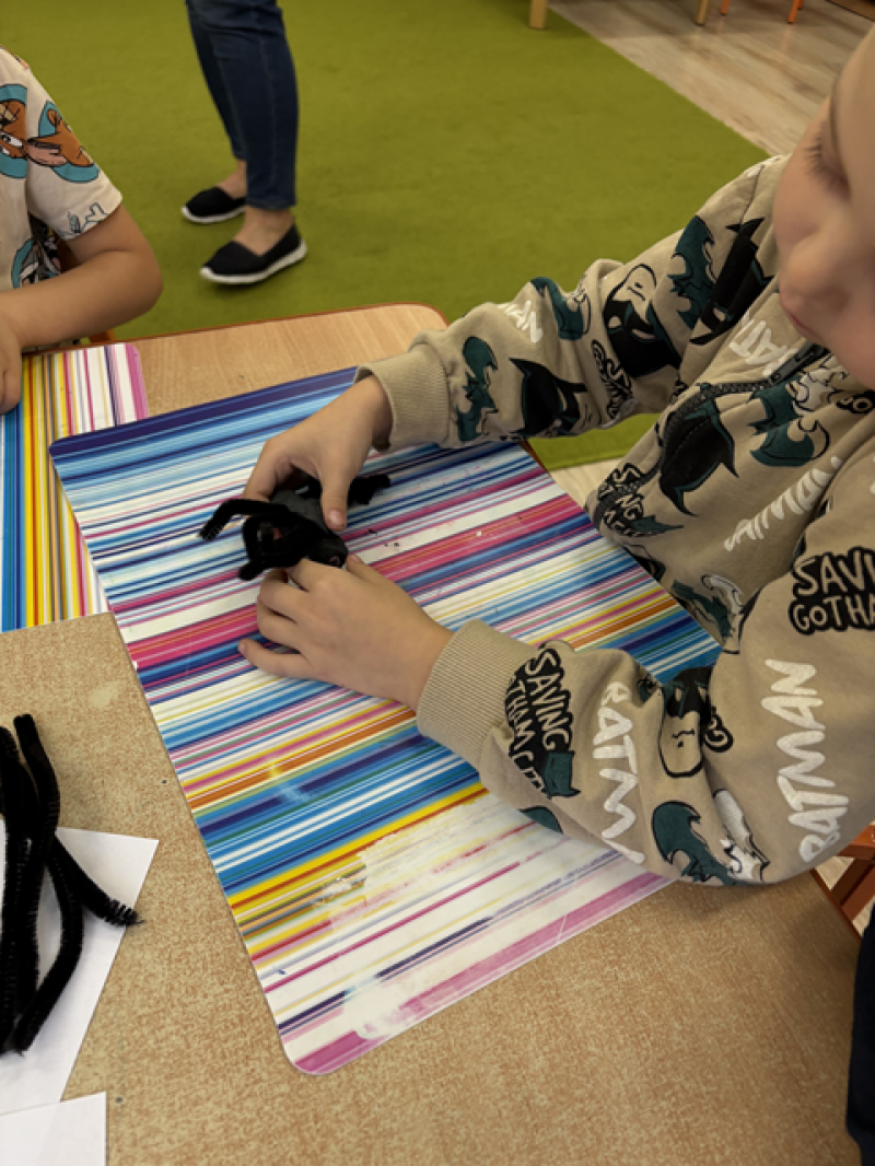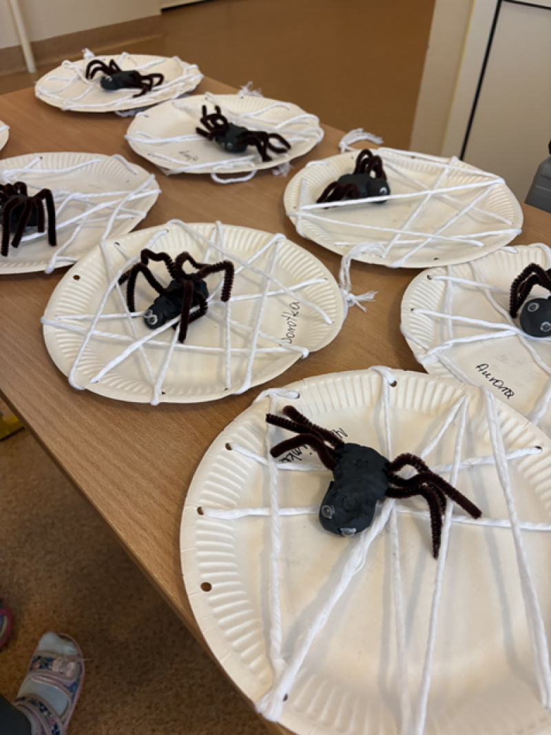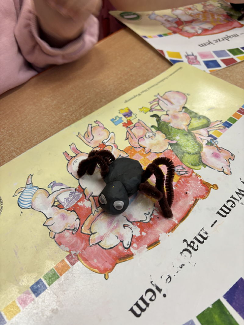 Dzieci rozwiązywały karty pracy, tworzyły pajęczą sieć z talerzyka papierowego i sznurka, a także wykonały własnego pająka z plasteliny i drucików kreatywnych.