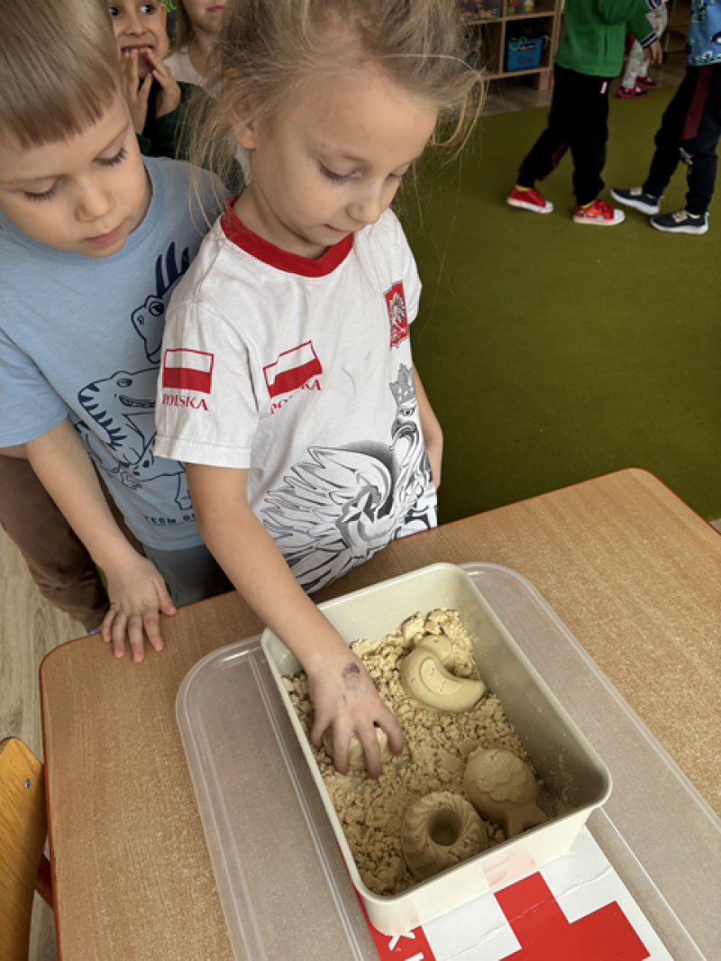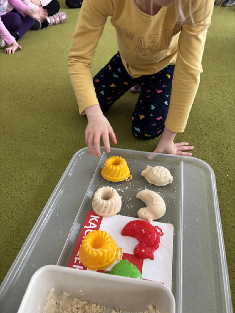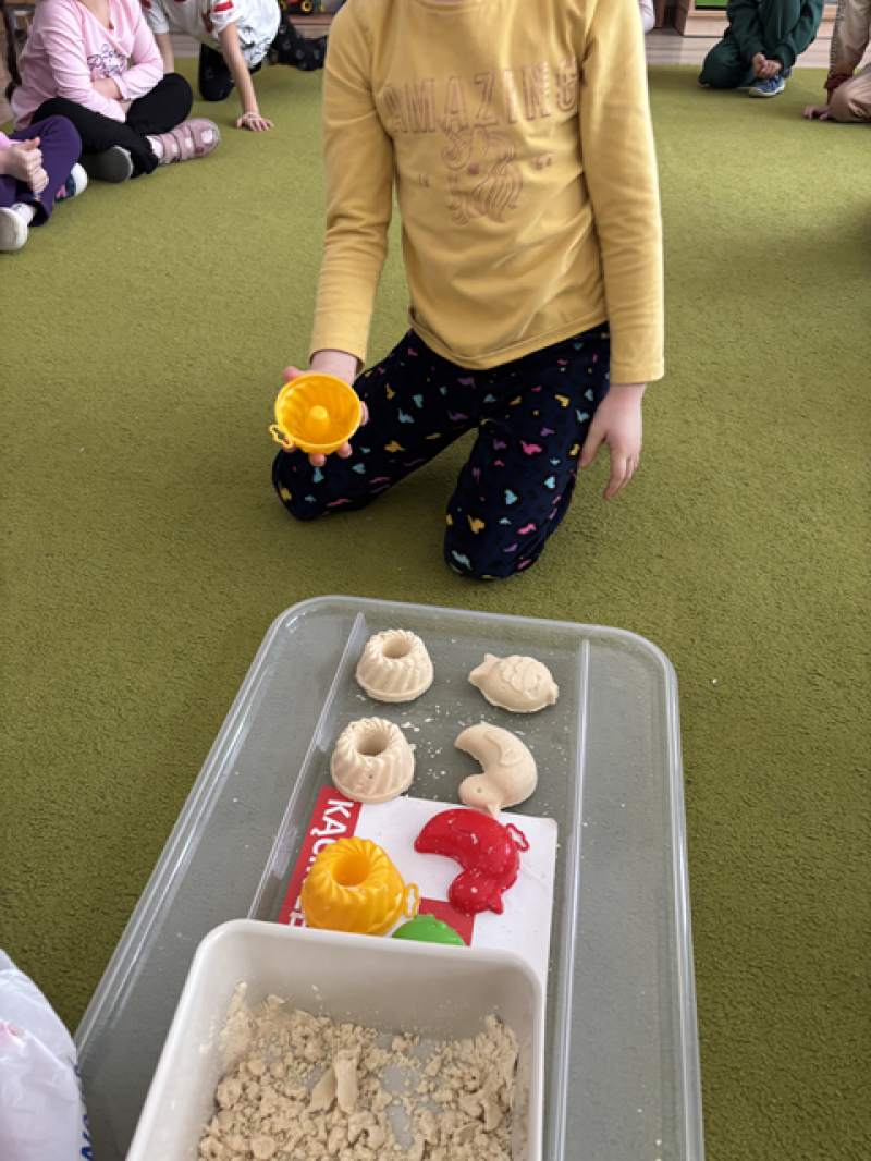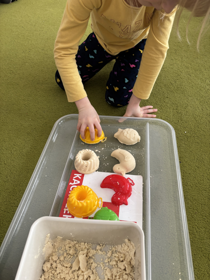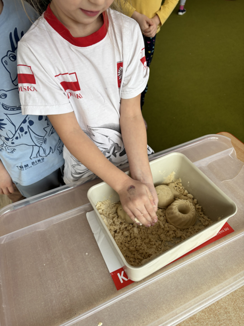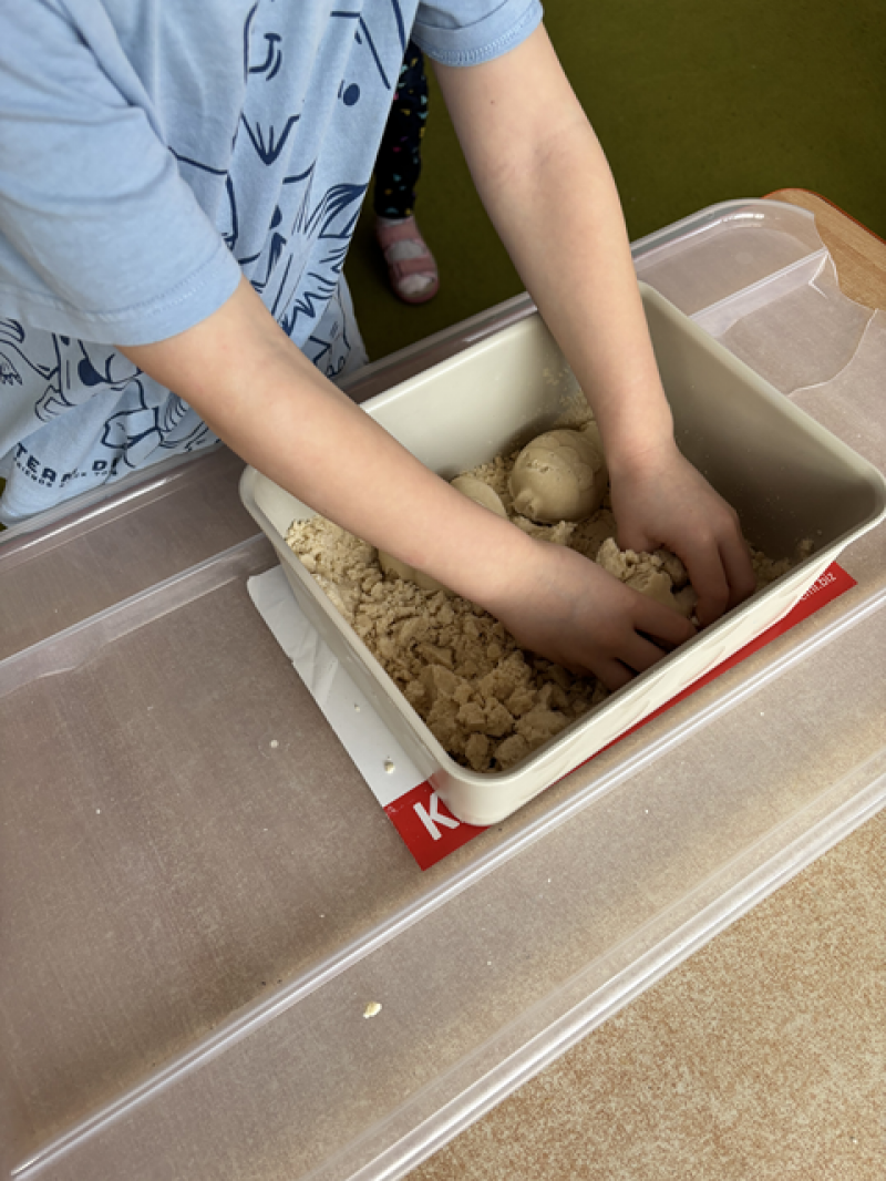 - Wykonanie piasku kinetycznego (doświadczanie przez dotyk),