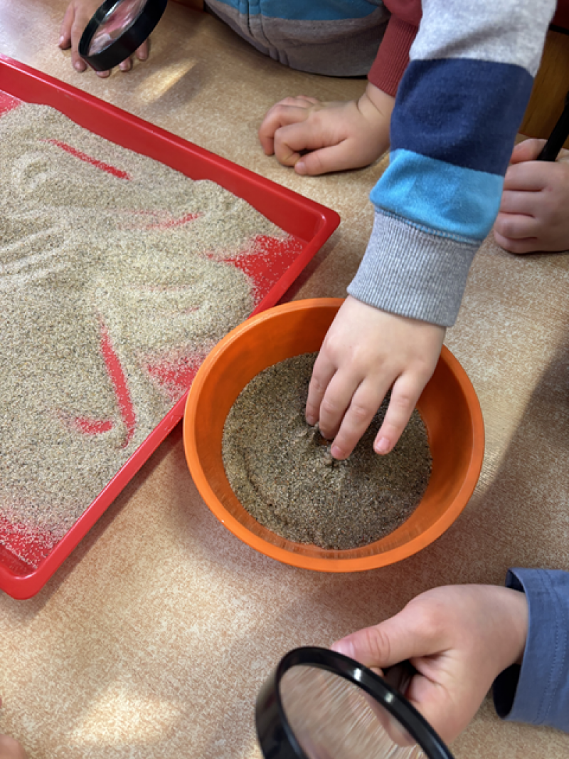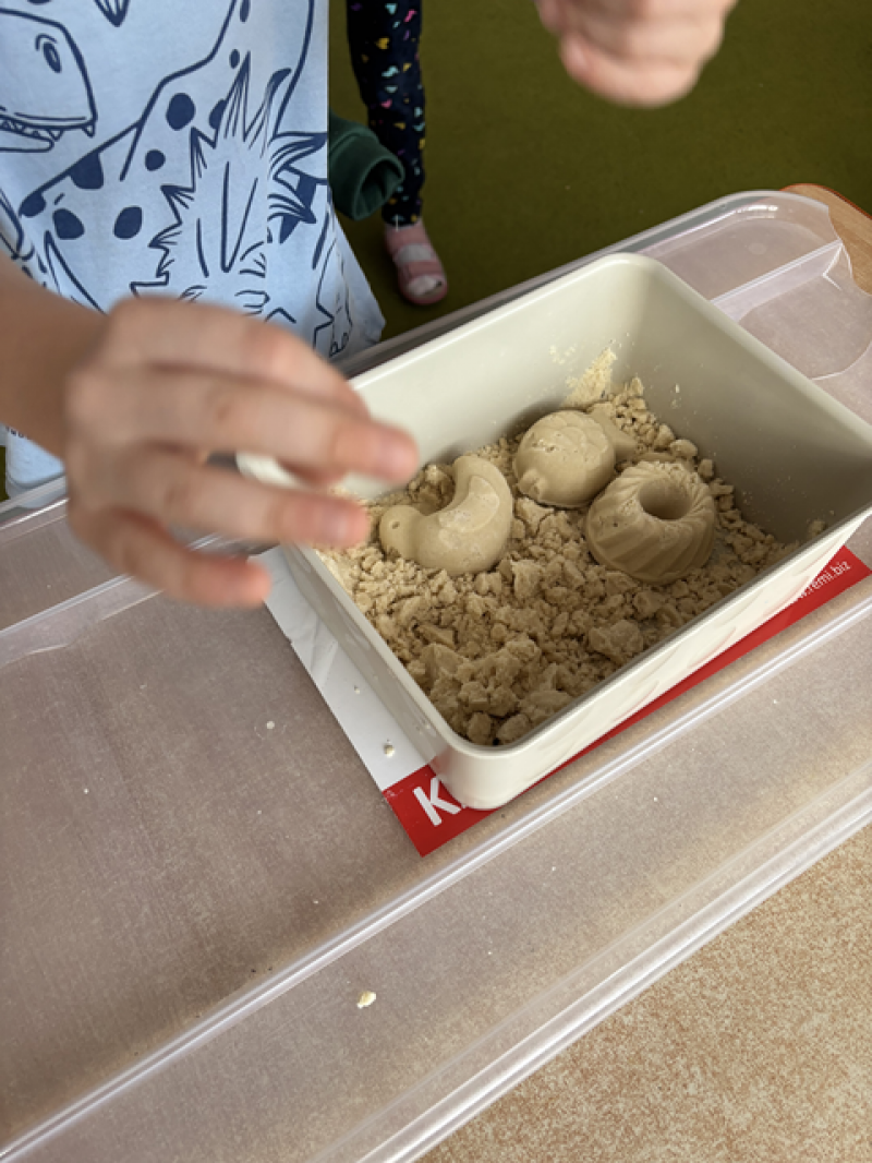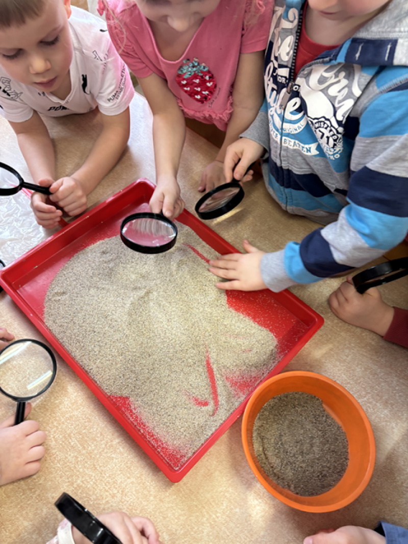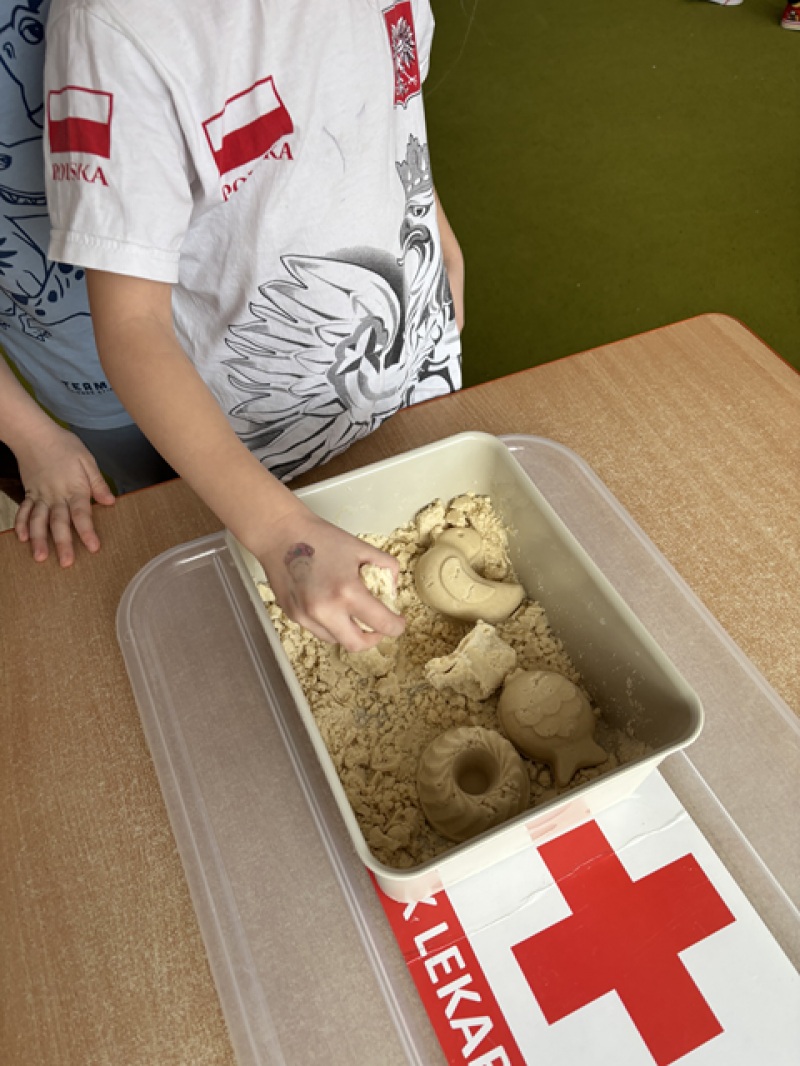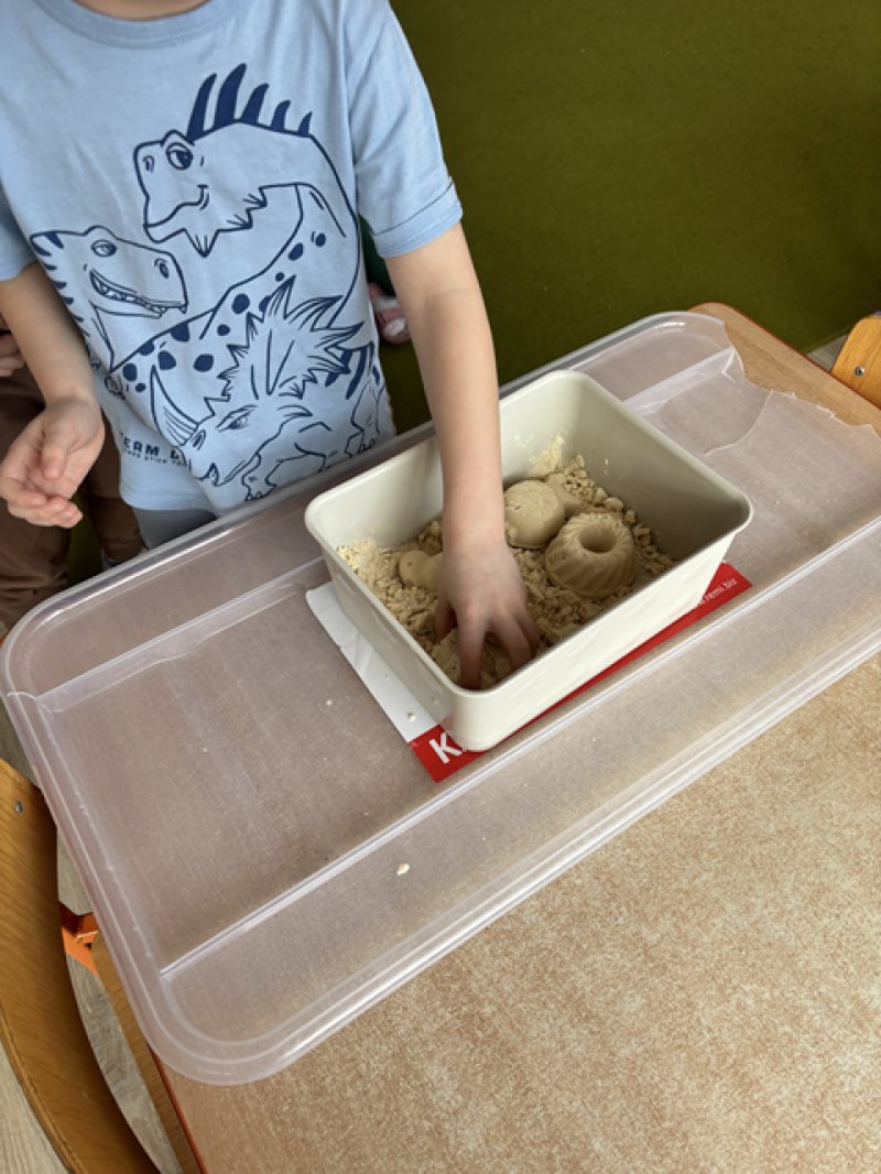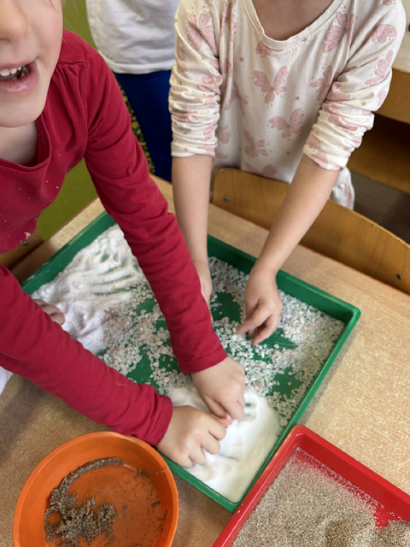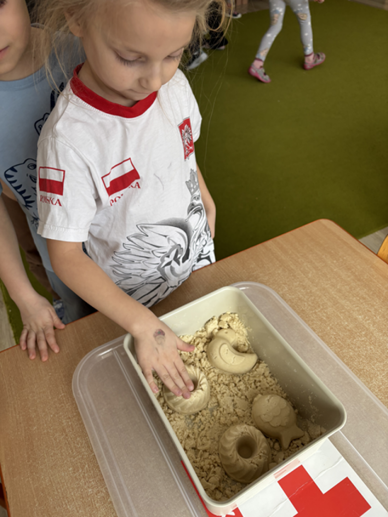 - Wykonanie piasku kinetycznego (doświadczanie przez dotyk),