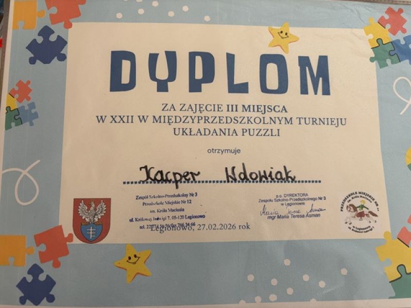 27.02.2026r. – Kacper z grupy III reprezentował nasze Przedszkole w XXII Międzyprzedszkolnym Turnieju Układania Puzzli dla dzieci 5 letnich zorganizowanym przez Przedszkole Miejskie Nr 12 w Legionowie.