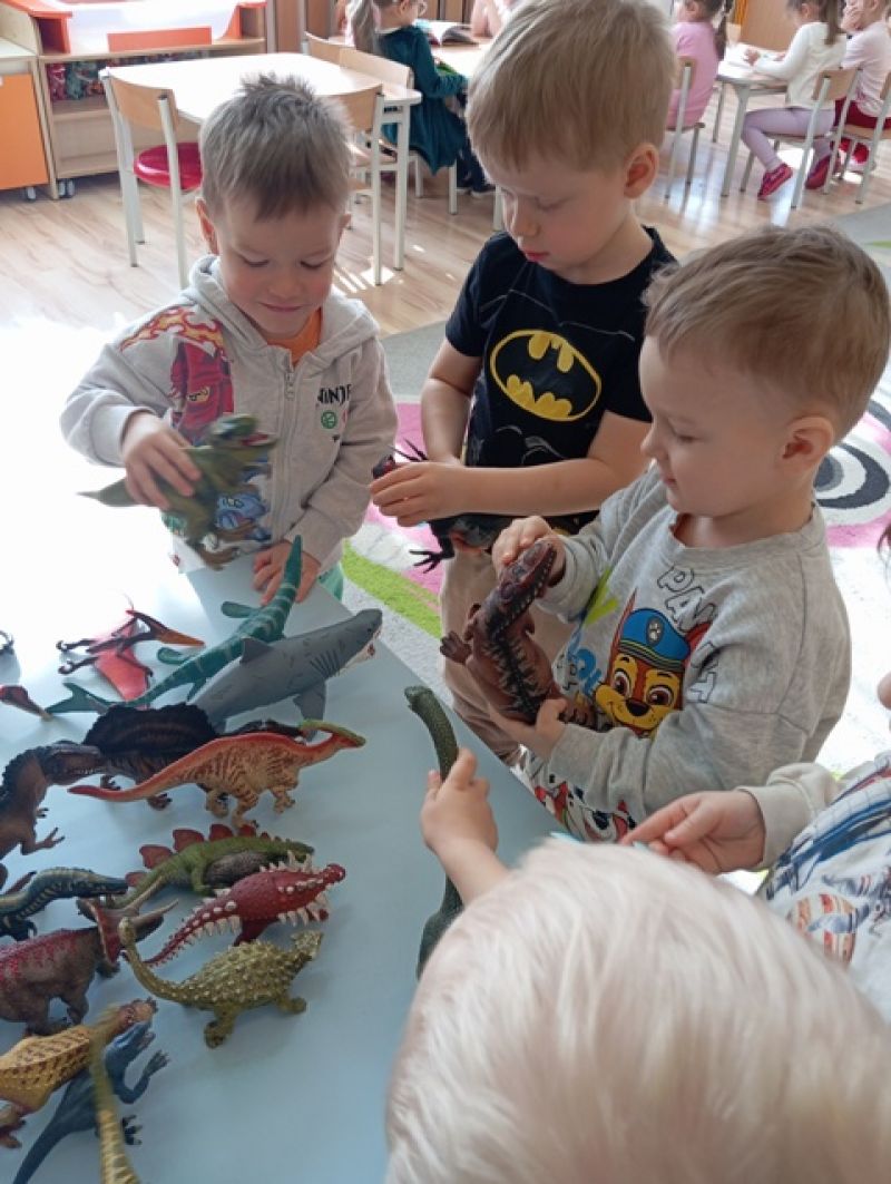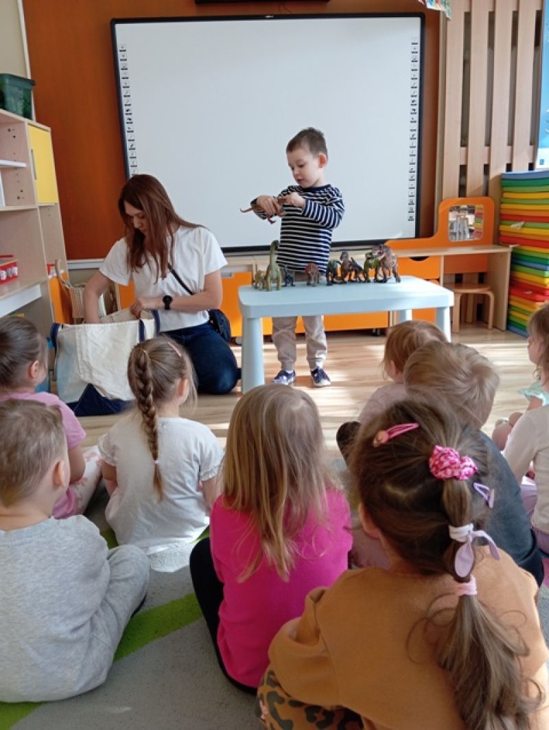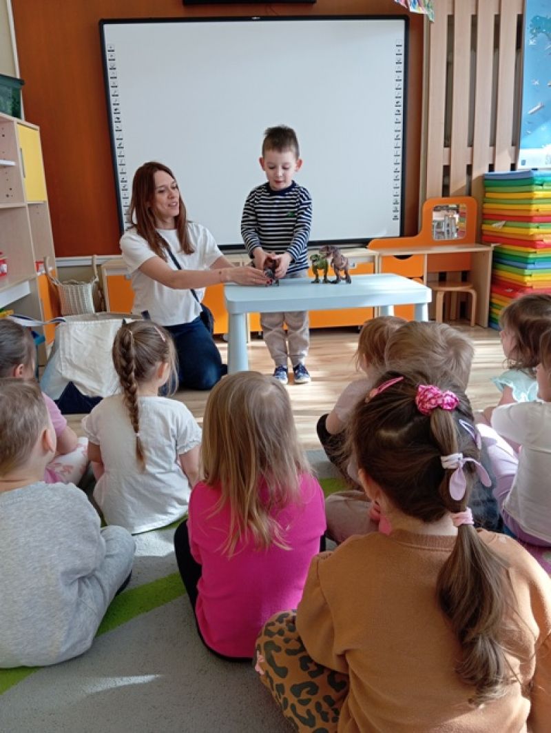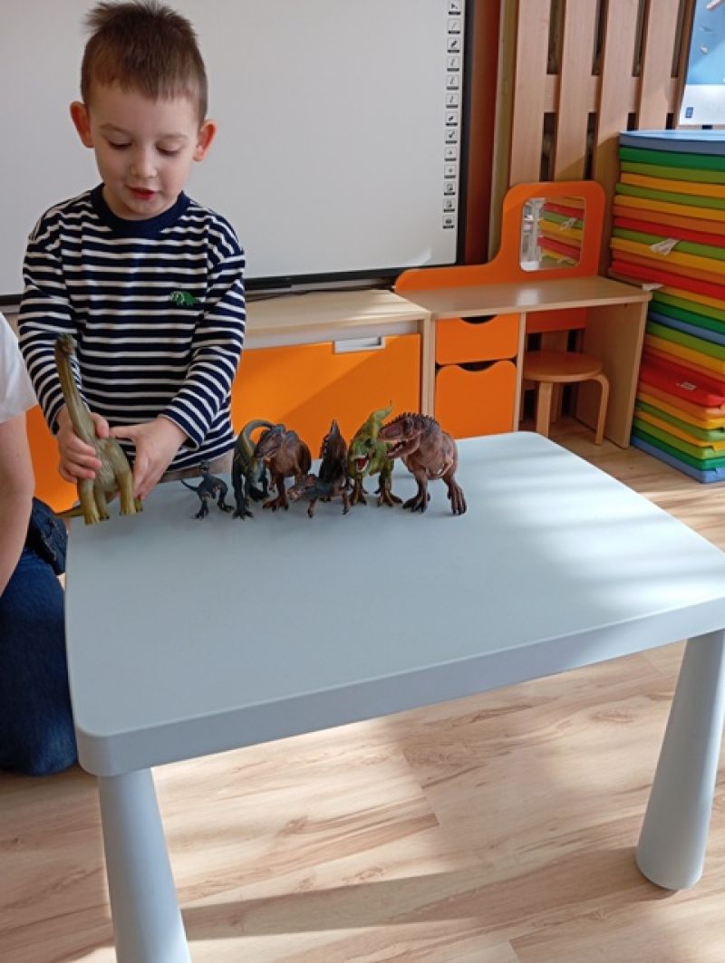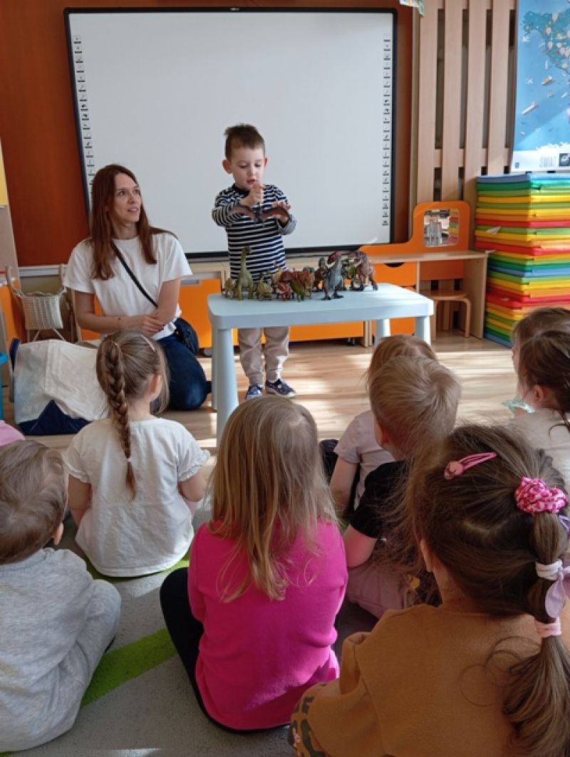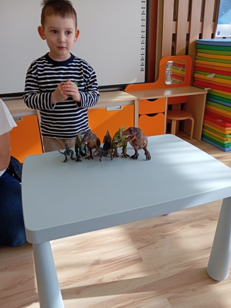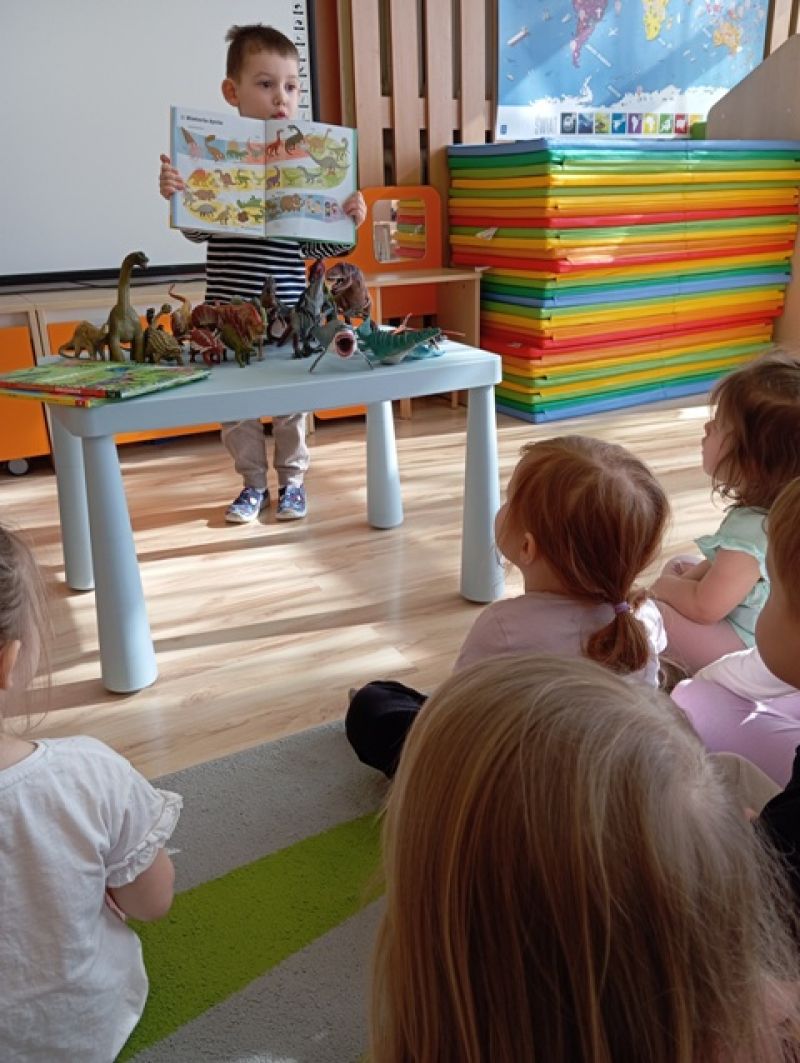 16.03.2026 - Kuba z grupy I zaprezentował dzieciom swoją kolekcję dinozaurów oraz książki o tych prehistorycznych zwierzętach.