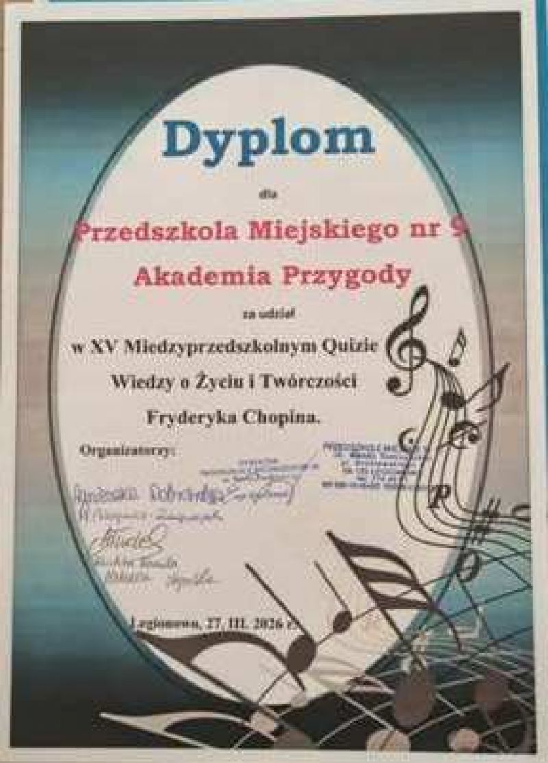 27.03.2026 - serdeczne gratulacje dla Izy z grupy V, która reprezentowała nasze Przedszkole w XV Międzyprzedszkolnym Quizie Wiedzy o Fryderyku Chopinie, którego organizatorem było Przedszkole Miejskie nr 10 im. Wandy Tomczyńskiej w Legionowie.
