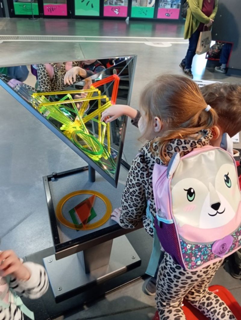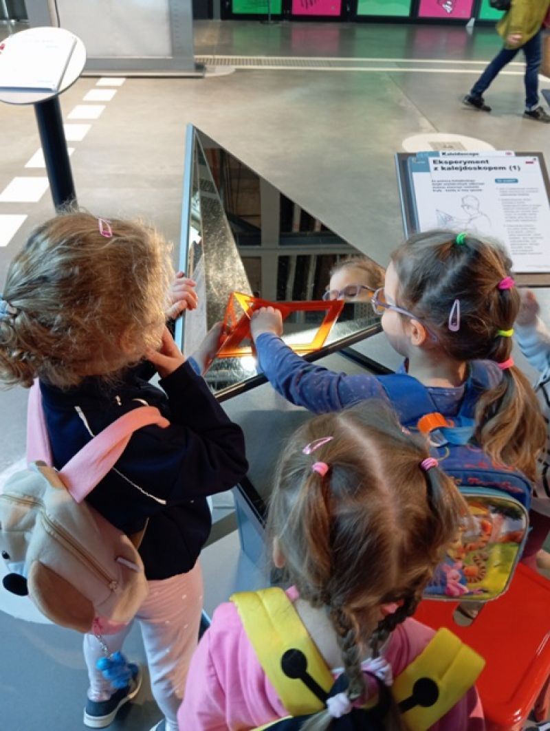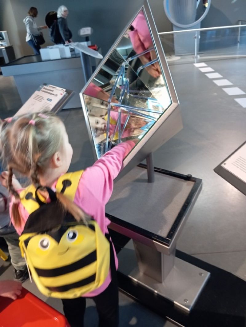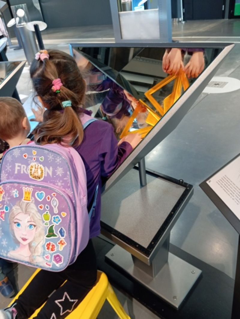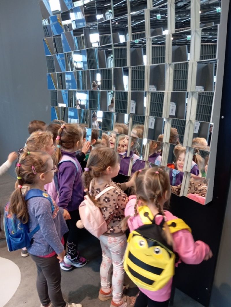 Dzieci zwiedzały wystawę "Lustra. Między iluzją a rzeczywistością". W otoczeniu specjalnie zaprojektowanej scenografii poznawały niezwykłe właściwości luster – zobaczyły, jak zwierciadła odbijają świat, zniekształcają kształty i zwielokrotniają odbicia.