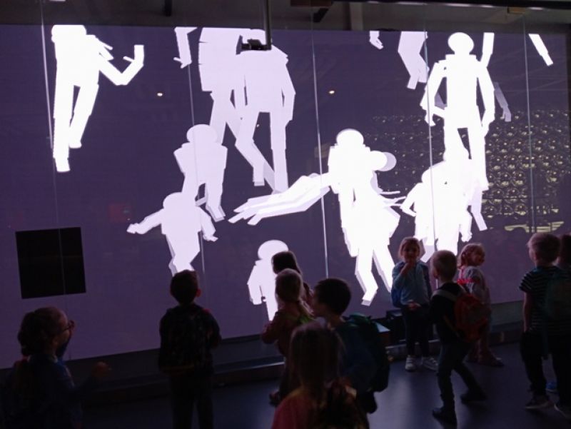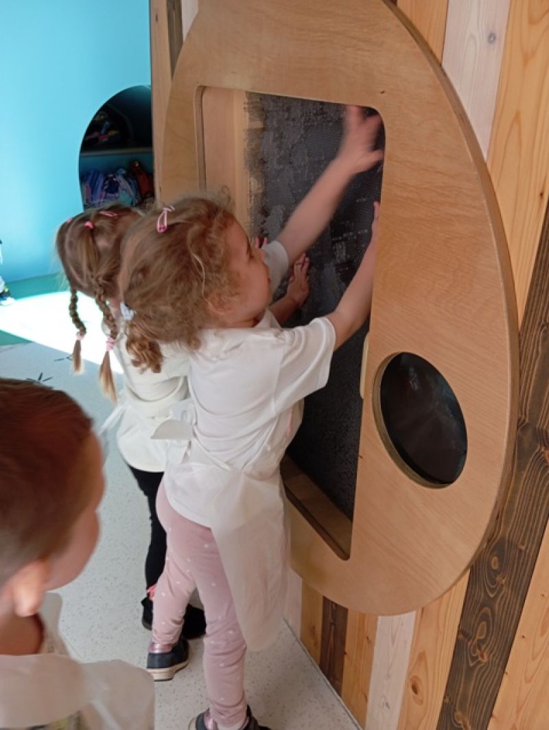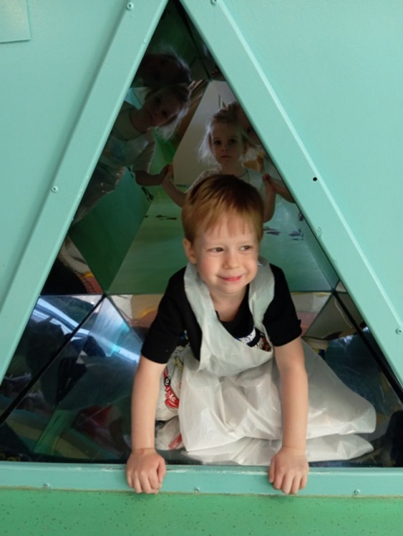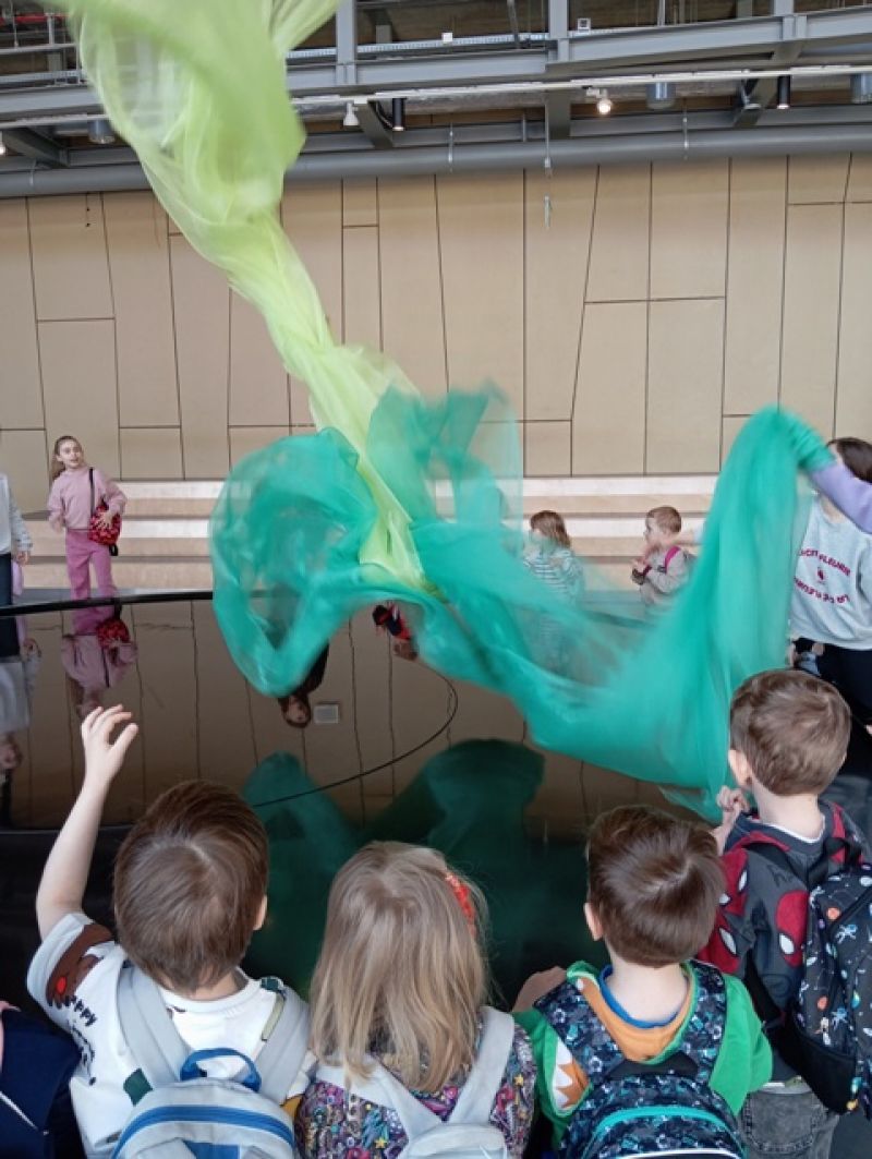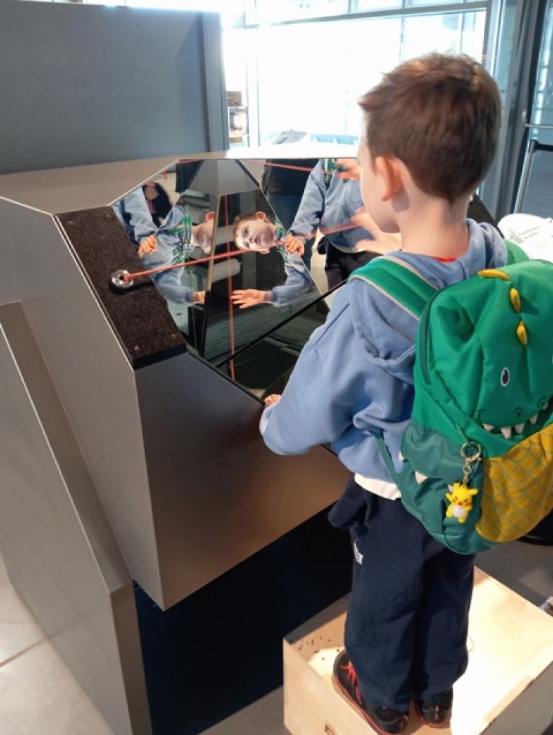 Dzieci zwiedzały wystawę "Lustra. Między iluzją a rzeczywistością". W otoczeniu specjalnie zaprojektowanej scenografii poznawały niezwykłe właściwości luster – zobaczyły, jak zwierciadła odbijają świat, zniekształcają kształty i zwielokrotniają odbicia.